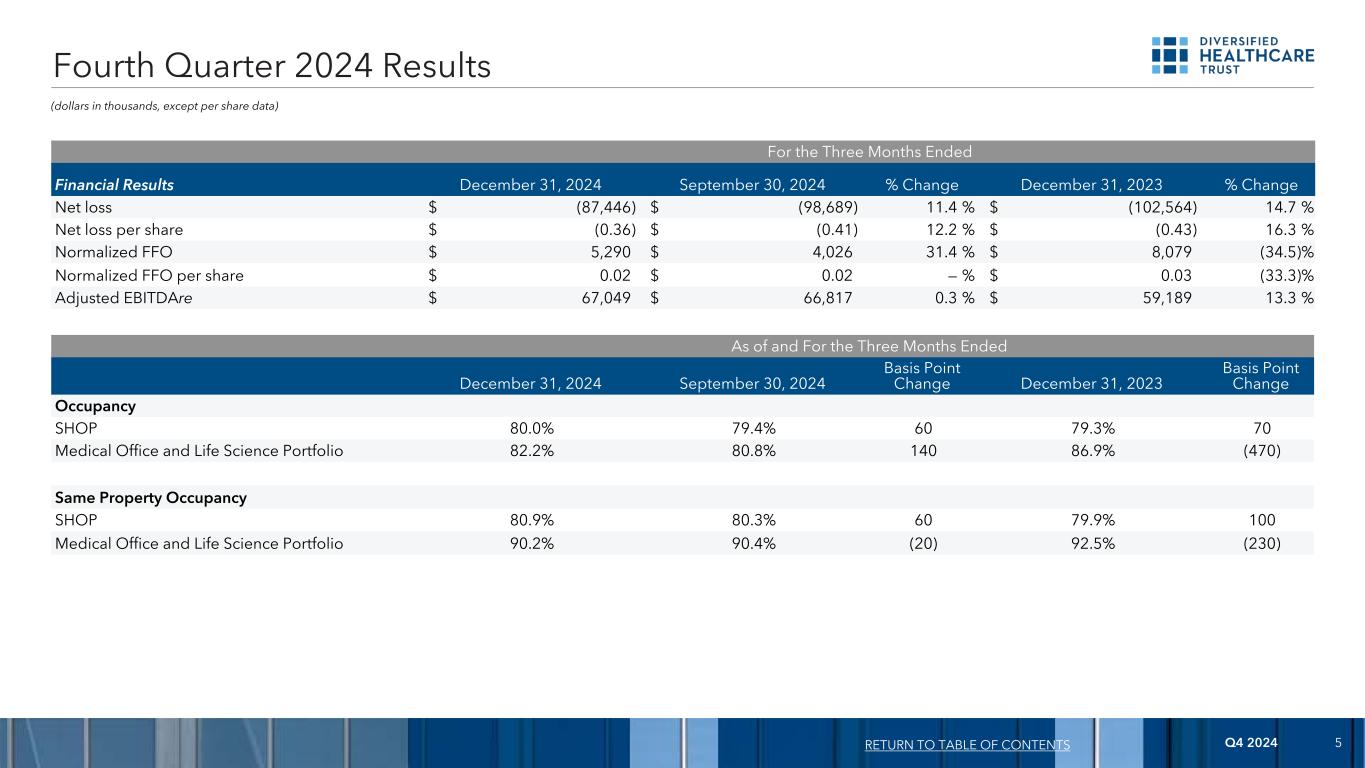 2024年第四季度4财务业绩2024年第四季度亮点回归目录运营更新流动性、融资和投资活动•净亏损8740万美元,合每股0.36美元。•正常化FFO为530万美元,合每股0.02美元。•同比去年第四季度SHOP入住率增长70个基点至80.0%,平均月费率增长6.7%,导致SHOP收入增长7.3%。•综合SHOP NOI同比增长56.0%至2490万美元,其中包括250个基点的利润率增长。•以相同空间的加权平均租金较之前租金高出6.9%的加权平均租金租赁了DHC的医疗办公室和生命科学投资组合中的111,812平方英尺。•大约1.499亿美元的现金和现金等价物以及限制性现金。•截至2025年2月21日,DHC已与多家贷方执行了预期贷款总收益约为2.760亿美元的条款清单,并正在与另一家贷方就预期收益为6400万美元进行积极谈判。• 2025年2月14日,DHC获得AlerisLife发放的现金红利1700.00万美元。• 2024年11月,DHC使用6000万美元现金部分赎回了当时未偿还的2025年6月到期的4.40亿美元高级无担保票据。DHC预计将使用其贷款收益、未设押物业销售收益和手头现金来赎回这些未偿还的优先票据中剩余的3.80亿美元。• DHC于2024年11月以660万美元的价格出售了一处未设押财产,并于2025年1月和2月以总计1970万美元的价格出售了另外两处未设押财产。截至2025年2月24日,DHC正在根据协议或意向书以7750万美元的价格出售七处未设押房产。• 2025年1月,DHC出售了其中三处为其2026年到期的优先有担保票据提供担保的房产,销售价格为1.59亿美元,不包括交割成本。根据出售协议,DHC还有19处房产可以为这些优先票据提供担保,总售价为1.421亿美元,不包括交割成本。这些出售所得款项净额将用于部分赎回这些优先担保票据。截至三个月的相同财产现金基础NOI(千美元)2024年12月31日2024年9月30日%变动2023年12月31日%变动SHOP $ 28,761 $ 30,685(6.3)% $ 19,84344.9%医疗办公室和生命科学投资组合27,18627,570(1.4)% 27,0770.4%所有其他7,7466,36521.7% 6,72415.2%合并$ 63,693 $ 64,620(1.4)% $ 53,64418.7%截至2024年12月31日止三个月,除非另有说明