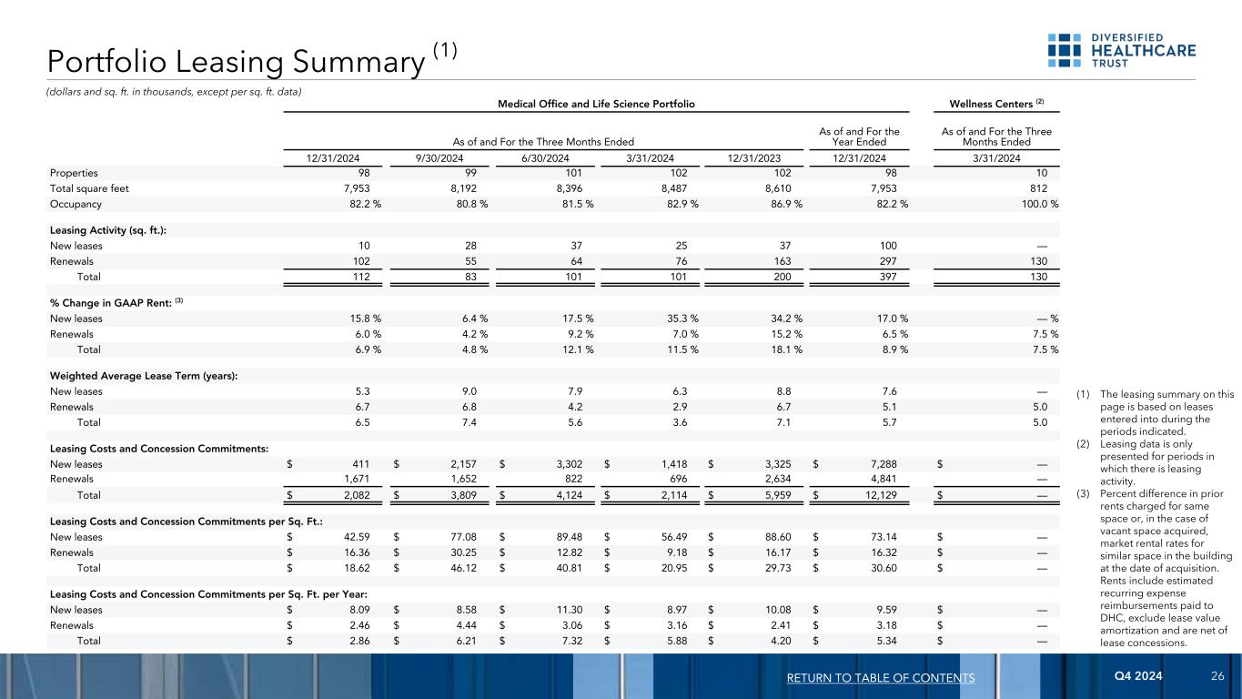 Q4 2024 26 Portfolio Leasing Summary(1)(1)本页的租赁摘要基于在所示期间订立的租赁。(2)租赁数据仅针对存在租赁活动的期间列报。(3)对相同空间收取的先前租金的差额百分比,或在获得空置空间的情况下,在获得之日建筑物中类似空间的市场租金比率。租金包括支付给DHC的估计经常性费用偿还,不包括租赁价值摊销,并已扣除租赁特许权。返回目录医疗办公室和生命科学组合健康中心(2)截至和截至三个月的截至和截至年度的截至及截至12/31/20249/30/20246/30/20243/31/202412/31/202312/31/20243/31/2024物业98991011021029810总平方英尺7,9538,1928,3968,4878,6107,953812入住率82.2% 80.8% 81.5% 82.9% 86.9% 82.2% 100.0%租赁活动(平方英尺):新租赁1028372537100 —续租102556476163297130合计11283 101101200397130% GAAP租金变化:(3)新租赁15.8% 6.4% 17.5% 35.3% 34.2% 17.0% —%续租6.0%4.2% 9.2% 7.0% 15.2% 6.5% 7.5%合计6.9% 4.8% 12.1% 11.5% 18.1% 8.9% 7.5%加权平均租赁期限(年):新租赁5.39.07.96.38.87.6 —续租6.76.84.2 2.96.75.15.0合计6.57.45.6 3.67.15.75.0租赁成本和特许权承诺:新租约$ 411 $ 2,157 $ 3,302 $ 1,418 $ 3,325 $ 7,288 $ —续租1,6711,6528226962,6344,841 —总计$ 2,082 $ 3,809 $ 4,124 $ 2,114 $ 5,959 $ 12,129 $ —每平方米的租赁成本和特许权承诺。英尺:新租赁42.59美元77.08美元89.48美元56.49美元88.60美元73.14美元—续租16.36美元30.25美元12.82美元9.18美元16.17美元16.32美元—总计18.62美元46.12美元40.81美元20.95美元29.73美元30.60美元—每平方米的租赁成本和特许权承诺。每年英尺:新租约8.09美元8.58美元11.30美元8.97美元10.08美元9.59美元——续租2.46美元4.44美元3.06美元3.16美元2.41美元3.18美元——总计2.86美元6.21美元7.32美元5.88美元4.20美元5.34美元——(以千美元和平方英尺计,每平方英尺数据除外)
