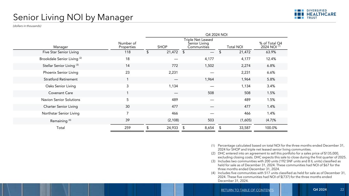 2024年第四季度按运营商划分的19个商店单元返回目录截至12月31日的单位数量,2024年度经理位置物业数目(1)辅助生活医疗独立生活和主动成人记忆护理熟练护理总计五星老年生活各种(28个州)1186,3119,5571,564 — 17,432 Charter Senior Living FL/MD/TN/VA/IL/WI 301,338 — 421 — 1,759 Oaks-Caravita Senior Care GA/SC 261,06140314 — 1,415 Phoenix Senior Living AL/AR/KY/MO/NC/SC 239331472131641,457 Stellar Senior Living(2)CO/TX/WY 10 — 177208971,094 Northstar Senior Living AZ/加利福尼亚州 7121 — 297 — 418 Navion Senior Solutions SC 5213 — 25 — 238 Life Care Services(3)DE37319412238517159 — 105 — 264 IntegraCare Senior Living PA 2 113 — 33 — 146 Omega Senior Living NE 169 ———— 69 The RMR Group TX 1 — 169 —— 169合计22910,39110,2843,0041,29924,978%合计41.6% 41.2% 12.0% 5.2% 100%(1)不包括三个封闭式养老生活社区。(2)包括截至2024年12月31日分类为持有待售的200个单位(192个SNF单位和8个IL单位)的两个社区。截至2024年12月31日的三个月,这些社区的NOI为10万美元。(3)截至2024年12月31日,这些社区被归类为持有待售,截至2024年12月31日止三个月的NOI为(0.5)百万美元。