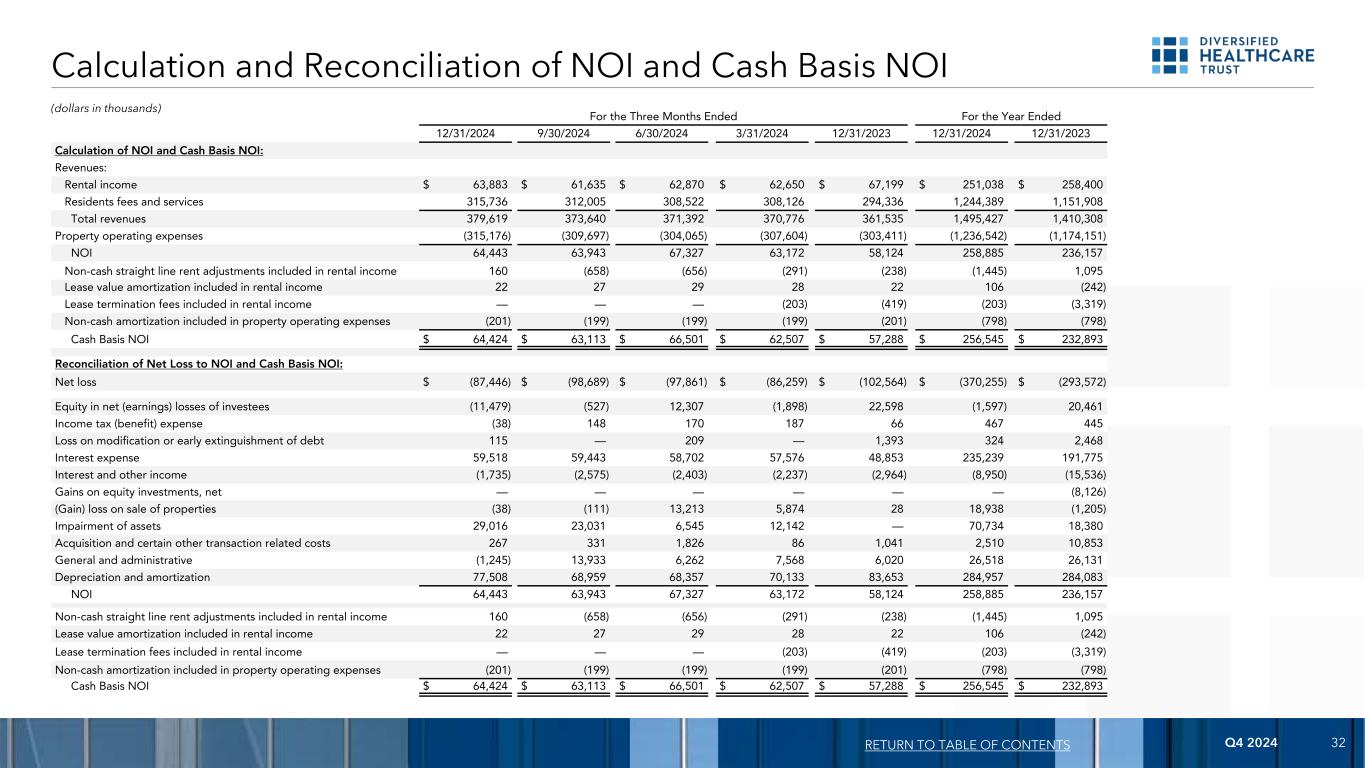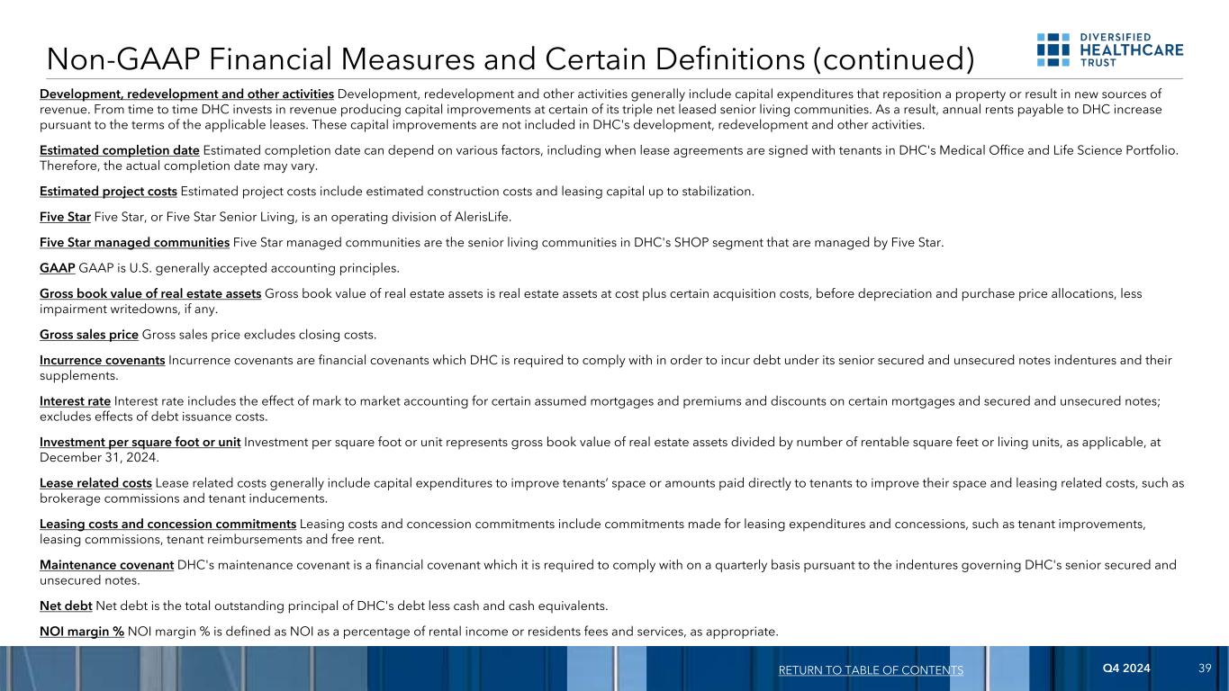 2024 Q4 39开发、再开发和其他活动开发、再开发和其他活动通常包括重新定位物业或产生新收入来源的资本支出。DHC不时对其某些三重净租赁的老年生活社区进行创收资本改善投资。因此,根据适用租约的条款,应付给DHC的年租金增加。这些基本建设改进不包括在DHC的开发、再开发和其他活动中。预计完工日期预计完工日期可能取决于各种因素,包括何时与DHC的医疗办公室和生命科学投资组合中的租户签署租赁协议。因此,实际完成日期可能会有所不同。估计项目成本估计项目成本包括估计建设成本和租赁资本直至稳定。五星五星,即五星养老,是AlerisLife的一个运营分部。五星管理社区五星管理社区是由五星电器管理的DHC SHOP板块中的老年生活社区。GAAP GAAP是美国公认会计原则。房地产资产的账面总值房地产资产的账面总值是按成本加上一定购置成本的房地产资产,在折旧和购买价格分配之前,减去减值减记(如果有的话)。毛销价毛销价不包括结算成本。发生契约发生契约是DHC为产生其优先有担保和无担保票据契约及其补充项下的债务而必须遵守的财务契约。利率利率包括某些假定抵押按市值计价的影响以及某些抵押和有担保和无担保票据的溢价和折价;不包括债务发行成本的影响。每平方英尺或单位的投资每平方英尺或单位的投资是指截至2024年12月31日房地产资产的账面总值除以可出租平方英尺或生活单元的数量(如适用)。租赁相关成本租赁相关成本一般包括改善租户空间的资本支出或直接支付给租户以改善其空间的金额以及租赁相关成本,例如经纪佣金和租户诱导。租赁成本和特许权承诺租赁成本和特许权承诺包括为租赁支出和特许权所作的承诺,例如租户改善、租赁佣金、租户补偿和免费租金。维护契约DHC的维护契约是一项财务契约,根据管辖DHC的优先有担保和无担保票据的契约,它必须按季度遵守该契约。净债务净债务是DHC债务的未偿本金总额减去现金及现金等价物。NOI margin % NOI margin %定义为NOI作为租金收入或居民费用和服务的百分比,视情况而定。Non-GAAP财务指标和某些定义(续)返回目录