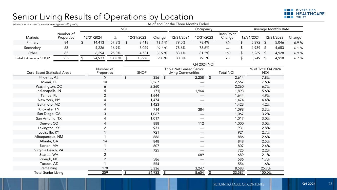 2024 Q4 22 Senior Living NOI by Manager RETURN to Table of Contents Q4 2024 NOI Manager Number of Properties SHOP Triple Net Leased Senior Living Communities Total NOI % of Total Q4 2024 NOI(1)Five Star Senior Living 118 $ 21,472 $ — $ 21,47263.9% 布鲁克代尔高级护理(2)18 — 4,1774,17712.4% Stellar Senior Living(3)147721,5022,2746.8% Phoenix Senior Living 232,231 — 2,2311.6% Stratford Retirement 1 — 1,9641,9645.8% Oaks Senior Living 31,134 — 1,1343.4% Covenant Care 1 — 5085081.5% Nav489 — 4891.5% Charter Senior Living 30477 — 4771.4% Northstar Senior Living 7466 — 4661.4%剩余(4)39(2,108)503(1,605)(4.7)%合计259 $ 24,933 $ 8,654 $ 33,587100.0%(1)百分比根据SHOP和三重净租赁老年生活社区截至2024年12月31日止三个月的NOI总额计算。(2)DHC签订协议,将出售该投资组合,销售价格为13.5万美元,不包括交割费用。DHC预计此次出售将在2025年第一季度完成。(3)包括截至2024年12月31日分类为持有待售的200个单位(192个SNF单位和8个IL单位)的两个社区。截至2024年12月31日的三个月,这些社区的NOI为67美元。(4)包括截至2024年12月31日分类为持有待售的517个单位的五个社区。截至2024年12月31日的三个月,这五个社区的NOI为$(737)。(千美元)