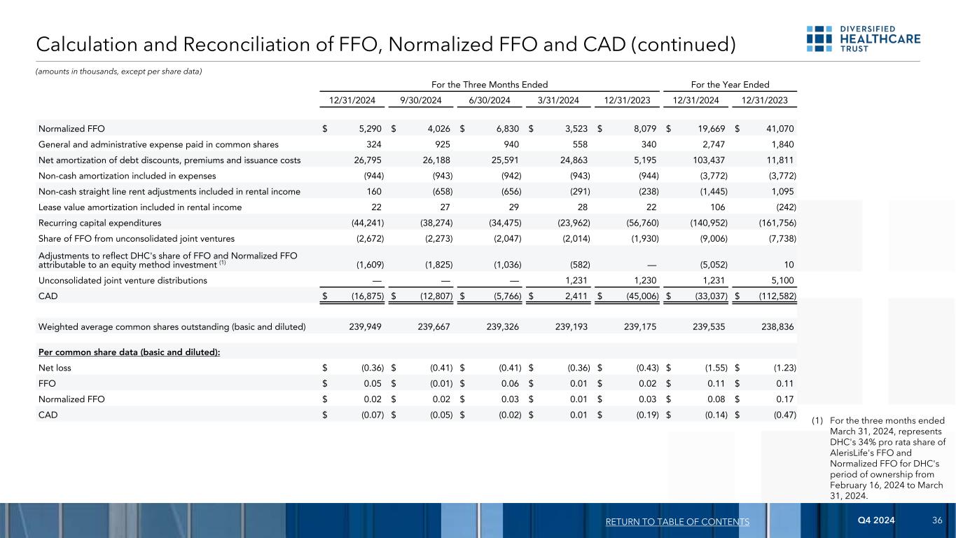 Q4 2024 35截至12/31/2024年度三个月FFO、正常化FFO和CAD(千美元)目录回报的计算和调节9/30/20246/30/20243/31/202412/31/202312/31/202312/31/202312/31/2023净亏损$(87,446)$(98,689)$(97,861)$(86,259)$(102,564)$(370,255)$(293,572)折旧和摊销77,50868,95968,35770,13383,653284,957284,083(收益)出售物业损失(38)(111)13,2135,8742818,938(净额——————(8,126)权益被投资方净(盈)亏(11,479)(527)12,307(1,898)22,598(1,597)20,461应占未合并合营企业的FFO 2,6722,2732,0472,0 141,9309,0067,738调整以反映DHC应占权益法投资的FFO份额(1)1,5721,6989,955582 — 13,807(1,586)FFO 11,805(3,366)14,5632,5885,64525,59026,173业务管理激励费(1)(6,934)6,934(849)849 ————收购以及某些其他与交易相关的成本2673311,826861,0412,51010,853修改或提前清偿债务的损失115 — 209 — 1,3933242,468调整以反映DHC在归属于权益法投资的正常化FFO中所占份额(2)37127(8,919)——(8,755)1,576正常化FFO $ 5,290 $ 4,026 $ 6,830 $ 3,523 $ 8,079 $ 19,669 $ 41,070(1)在截至2024年12月31日的三个月内,DHC冲回了6,934美元的业务管理奖励费。DHC未就截至2024年12月31日止年度确认业务管理奖励费。(2)截至2024年3月31日止三个月,代表DHC于AlerisLife的FFO及DHC所有权期间(2024年2月16日至2024年3月31日)按比例持有34%的FFO及正常化FFO。