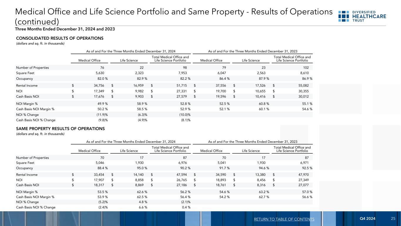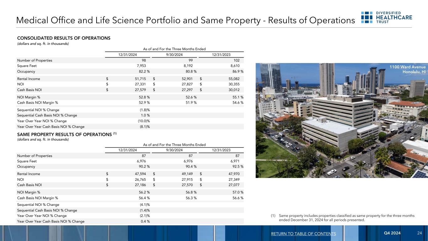 2024年第4季度24(1)同一物业包括截至2024年12月31日止三个月所有呈报期间分类为同一物业的物业。返回目录合并运营结果(美元和平方英尺,单位:千)截至截至12/31/20249/30/202412/31/2023止三个月物业数量9899102平方英尺7,9538,1928,610占用面积82.2% 80.8% 86.9%租金收入$ 51,715 $ 52,901 $ 55,082 NOI $ 27,331 $ 27,827 $ 30,355现金基础NOI $ 27,579 $ 27,297 $ 30,012 NOI margin % 52.8% 52.6% 55.1% cash basis NOI margin % 52.9% 51.9% 54.6% sequential NOI % change(1.8)% sequential cash basis NOI % change 1.0% year over year NOI % change(10.0)% year over year cash basis NOI %变动(8.1)%经营活动的相同财产结果(1)(美元和平方英尺,单位:千)截至及截至12/31/20249/30/202412/31/2023止三个月物业数目878787平方呎6,9766,9766,971入住率90.2% 90.4% 92.5%租金收入$ 47,594 $ 49,149 $ 47,970 NOI $ 26,765 $ 27,915 $ 27,349现金基础NOI $ 27,186 $ 27,570 $ 27,077 NOI Margin % 56.2% 56.8% 57.0%现金基础NOI Margin % 56.4% 56.3% 56.6%连续现金基础NOI %变化(4.1)%连续现金基础NOI %变化(1.4)%同比NOI %变化(2.1)%同比现金基础NOI %涨跌幅0.4%医疗办公室和生命科学投资组合和相同物业-运营结果1100 Ward Avenue Honolulu,HI