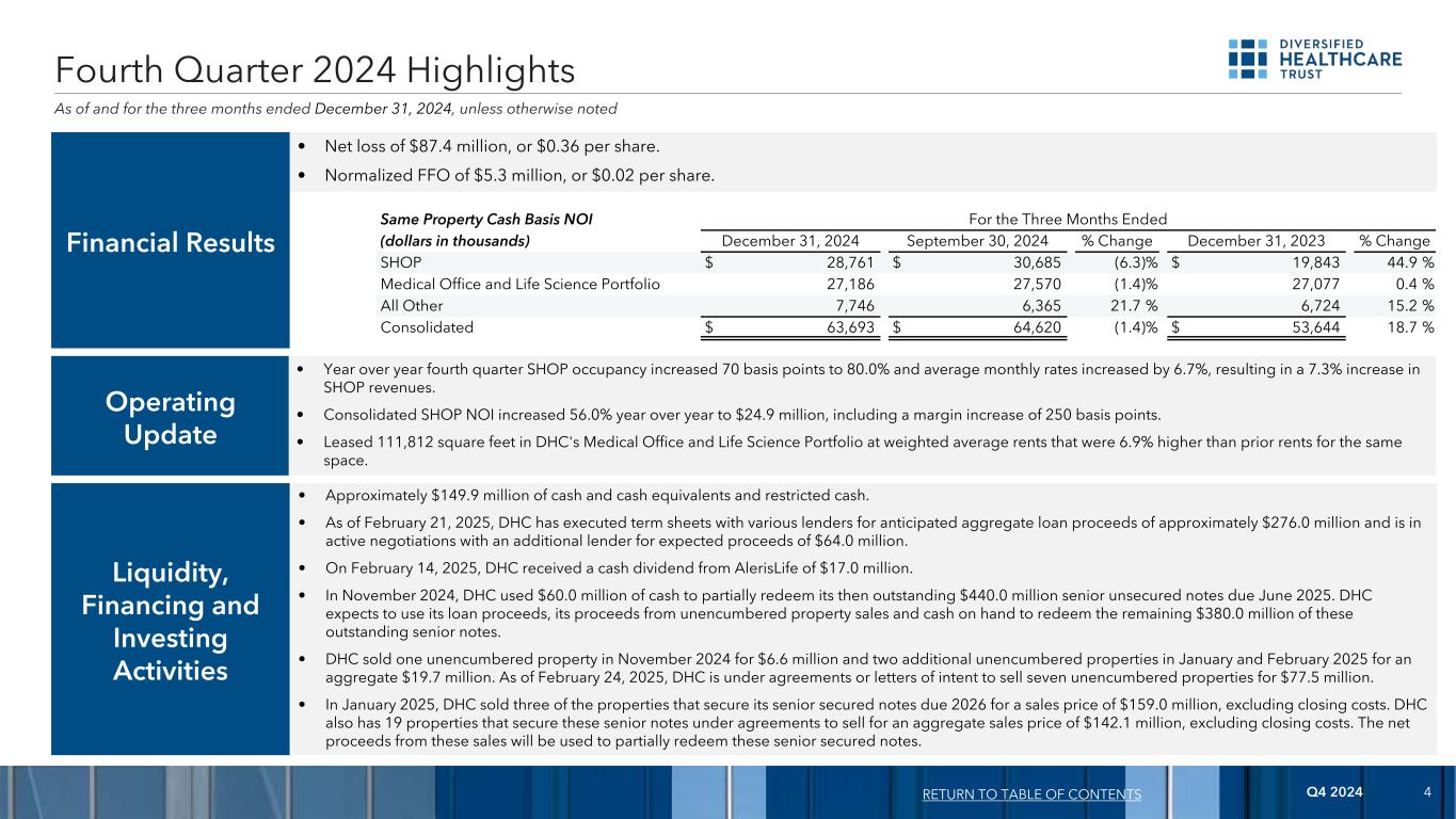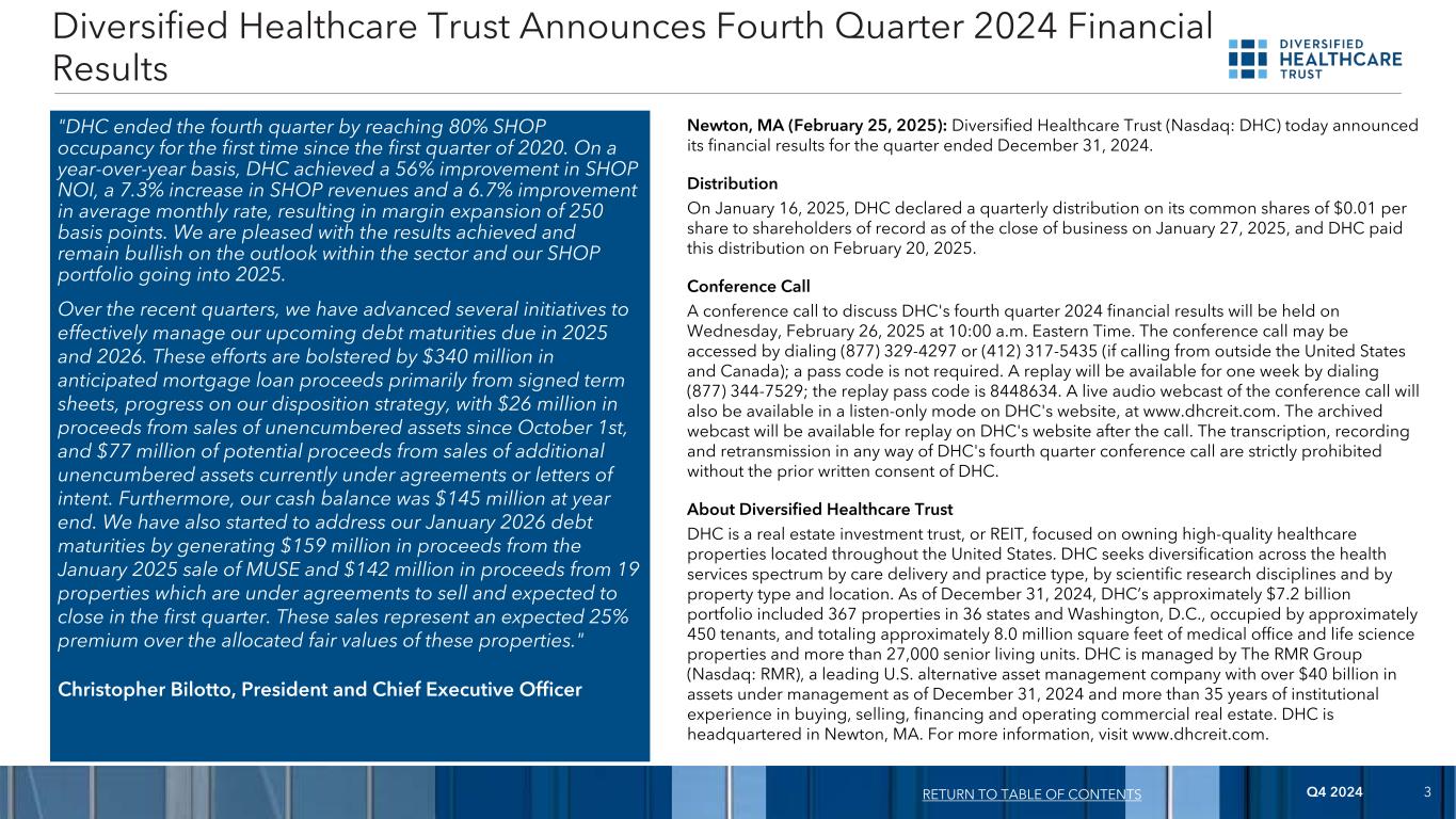 2024年第4季度3 " DHC在第四季度结束时,自2020年第一季度以来首次达到80%的店铺入住率。同比来看,DHC在SHOP NOI方面实现了56%的改善,SHOP收入增长了7.3%,平均月费率改善了6.7%,从而使利润率扩大了250个基点。我们对取得的成果感到满意,并继续看好该行业的前景以及我们到2025年的SHOP投资组合。最近几个季度,我们推进了多项举措,以有效管理即将于2025年和2026年到期的债务。这些努力得到了3.4亿美元的预期抵押贷款收益的支持,这些收益主要来自已签署的条款清单、我们处置战略的进展、自10月1日以来出售未设押资产的收益2600万美元,以及目前根据协议或意向书出售额外未设押资产的潜在收益7700万美元。此外,我们年底的现金余额为1.45亿美元。我们还开始解决2026年1月到期的债务问题,从2025年1月出售的MUSE中获得了1.59亿美元的收益,从19处正在签订出售协议并预计在第一季度结束的房产中获得了1.42亿美元的收益。这些销售预计将比这些物业分配的公允价值溢价25%。”Diversified Healthcare Trust总裁兼首席执行官Christopher Bilotto公布2024年第四季度财务业绩返回目录马萨诸塞州牛顿市(2025年2月25日):Diversified Healthcare Trust(纳斯达克,DHC)今天公布了截至2024年12月31日的季度财务业绩。分配于2025年1月16日,DHC宣布向截至2025年1月27日收盘时在册的股东进行普通股每股0.01美元的季度分配,DHC于2025年2月20日支付了此次分配。电话会议讨论DHC 2024年第四季度财务业绩的电话会议将于美国东部时间2025年2月26日(星期三)上午10:00举行。电话会议可拨打(877)329-4297或(412)317-5435(如果从美国和加拿大境外拨打);不需要密码。回放一周可拨打(877)344-7529;回放密码8448634。还将在DHC的网站www.dhcreit.com上以只听模式提供电话会议的现场音频网络广播。电话会议结束后,已归档的网络直播将可在DHC的网站上重播。未经DHC事先书面同意,严禁对DHC第四季度电话会议进行任何形式的转录、录音和转播。关于Diversified Healthcare TrustDHC是一家房地产投资信托基金,简称REIT,专注于拥有位于美国各地的优质医疗保健物业。DHC通过护理提供和实践类型、科学研究学科以及财产类型和位置,在整个健康服务范围内寻求多样化。截至2024年12月31日,DHC约72亿美元的投资组合包括位于36个州和华盛顿特区的367处房产,约有450名租户入住,以及总计约800万平方英尺的医疗办公和生命科学物业以及超过2.7万个老年生活单元。DHC由The RMR Group(纳斯达克:RMR)管理,该公司是美国领先的另类资产管理公司,截至2024年12月31日,该公司管理的资产规模超过400亿美元,在购买、销售、融资和运营商业房地产方面拥有超过35年的机构经验。DHC总部位于马萨诸塞州牛顿市。欲了解更多信息,请访问www.dhcreit.com。