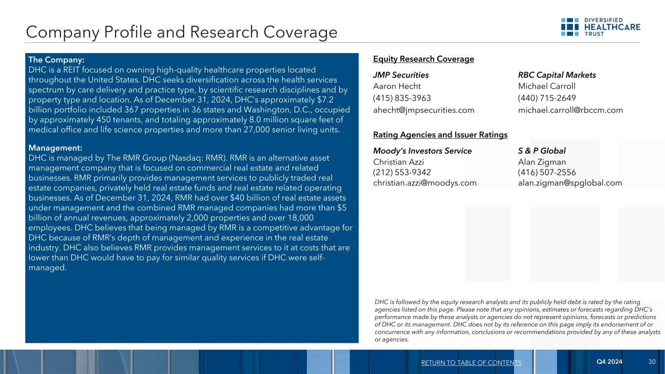 Q4 202430公司:DHC是一家专注于拥有遍布美国各地的优质医疗保健物业的房地产投资信托基金。DHC通过护理提供和实践类型、科学研究学科以及财产类型和位置,在整个健康服务范围内寻求多样化。截至2024年12月31日,DHC约72亿美元的投资组合包括位于36个州和华盛顿特区的367处房产,约有450名租户入住,以及总计约800万平方英尺的医疗办公和生命科学物业以及超过2.7万个老年生活单元。管理层:DHC由The RMR Group(纳斯达克:RMR)管理。RMR是一家专注于商业地产及相关业务的另类资产管理公司。RMR主要向上市房地产公司、私募持有的房地产基金及房地产相关经营业务提供管理服务。截至2024年12月31日,RMR管理着超过400亿美元的房地产资产,RMR管理的公司合并后的年收入超过50亿美元,拥有约2000处房产和超过18000名员工。DHC认为,由于RMR在房地产行业的管理深度和经验,由RMR管理对DHC来说是一种竞争优势。DHC还认为,RMR向其提供管理服务的成本低于如果DHC是自我管理的,TERM3将低于DHC为类似质量服务所必须支付的费用。公司简介和研究覆盖恢复到目录股票研究覆盖JMP Securities RBC Capital Markets Aaron Hecht Michael Carroll(415)835-3963(440)715-2649 ahecht@jmpsecurities.com michael.carroll@rbccm.com评级机构和发行人评级穆迪投资者服务公司(Moody’s Investors Service)丨S & P Global丨标普全球 Christian Azzi Alan Zigman(212)553-9342(416)507-2556 christian.azzi@moodys.com alan.zigman@spglobal.com DHC后面是股票研究分析师及其公开持有的债项由本页所列评级机构评级。请注意,这些分析师或机构对DHC的业绩所作的任何意见、估计或预测,并不代表DHC或其管理层的意见、预测或预测。DHC在此页面上的引用并不意味着其认可或同意任何这些分析师或机构提供的任何信息、结论或建议。