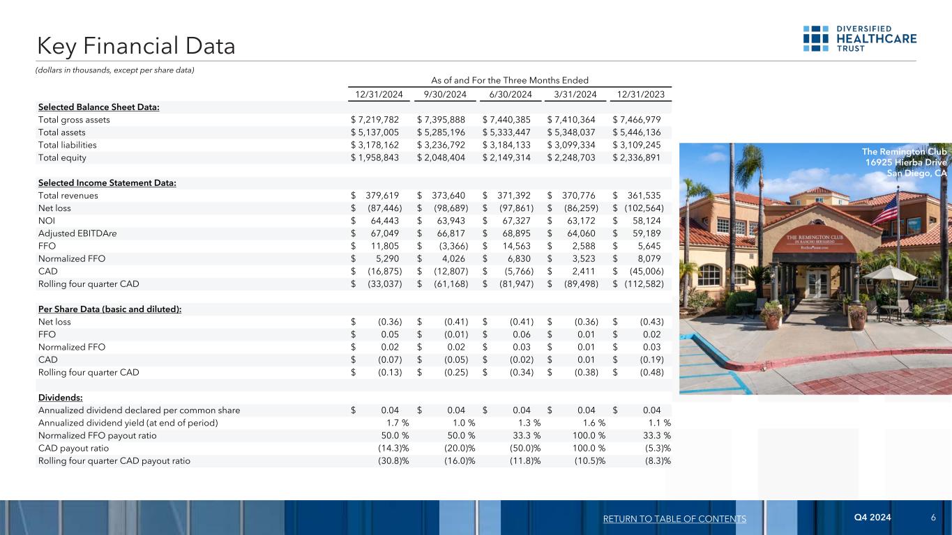 截至2024年Q4 6关键财务数据返回目录以及截至12/31/20249/30/20246/30/20243/31/202412/31/2023止三个月的选定资产负债表数据:总资产$ 7,219,782 $ 7,395,888 $ 7,440,385 $ 7,410,364 $ 7,466,979总资产$ 5,137,005 $ 5,285,196 $ 5,333,447 $ 5,348,037 $ 5,446,136总负债$ 3,178,162 $ 3,236,792 $ 3,184,133 $ 3,099,334 $ 3,109,245总权益$ 1,958,843 $ 2,048,404 $ 2,149,314 $ 2,248,703 $ 2,336,891选定损益表数据:总收入63,172美元58,124美元调整后EBITDA为67,049美元66,817美元68,895美元64,060美元59,189美元FFO 11,805美元(3,366)14,563美元2588美元5,645美元正常化FFO 5,290美元4,026美元6,830美元3,523美元8,079加元(16,875)美元(12,807)美元(5,766)美元2,411美元(45,006)滚动四季度加元(33,037)美元(61,168)美元(81,947)美元(89,498)美元(112,582)每股数据(基本和摊薄):净亏损$(0.36)$(0.41)$(0.41)$(0.36)$(0.43)FFO $ 0.05 $(0.01)$ 0.06 $ 0.01 $ 0.02正常化FFO $ 0.02 $ 0.02 $ 0.03 $ 0.01 $ 0.03加元$(0.07)$(0.05)$(0.02)$ 0.01 $(0.19)滚动四季度CAD $(0.13)$(0.25)$(0.34)$(0.38)$(0.48)股息:每股普通股宣布的年化股息$ 0.04 $ 0.04 $ 0.04 $ 0.04年化股息收益率(期末)1.7% 1.0% 1.3% 1.6% 1.1%正常化FFO派息率50.0% 50.0% 33.3% 100.0% 33.3% CAD派息率(14.3)%(20.0)%(50.0)% 100.0%(5.3)%滚动四季度CAD派息率(30.8)%(16.0)%(11.8)%(10.5)%(8.3)%(以千美元计,每股数据除外)The Remington Club 16925 Hierba Drive San Diego,加利福尼亚州
