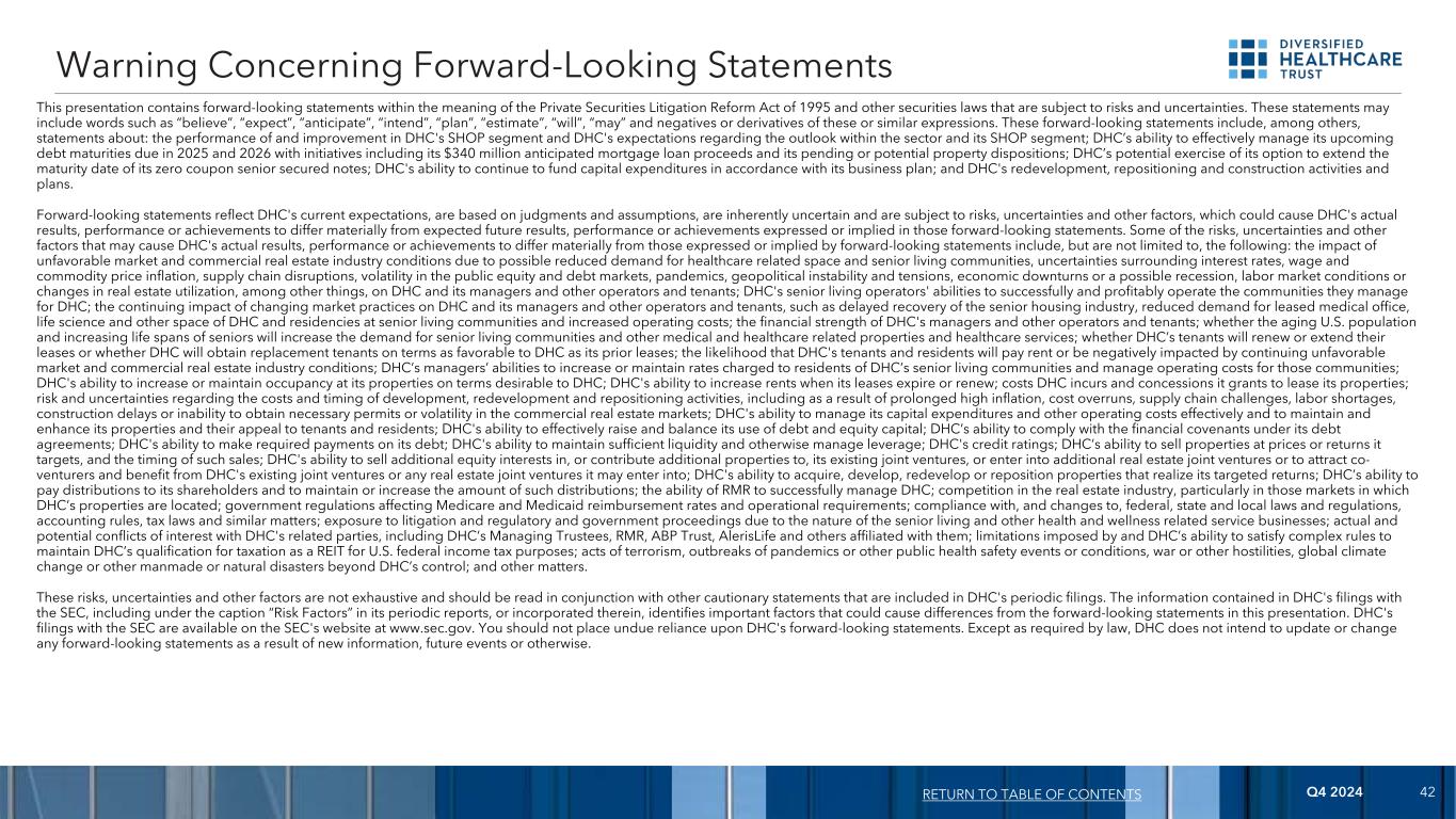 2024年第4季度42本演示文稿包含1995年《私人证券诉讼改革法案》和其他受风险和不确定性影响的证券法含义内的前瞻性陈述。这些陈述可能包括“相信”、“预期”、“预期”、“打算”、“计划”、“估计”、“将”、“可能”等词语,以及这些或类似表述的否定或衍生。除其他外,这些前瞻性陈述包括以下方面的陈述:DHC的SHOP部门的业绩和改善,以及DHC对该部门及其SHOP部门内前景的预期;DHC有能力有效管理其即将于2025年和2026年到期的债务,其举措包括其3.4亿美元的预期抵押贷款收益及其未决或潜在的财产处置;DHC可能行使其选择权以延长其零息优先有担保票据的到期日;DHC有能力根据其业务计划继续为资本支出提供资金;以及DHC的重建,重新定位和建设活动和计划。前瞻性陈述反映了DHC当前的预期,是基于判断和假设的,具有内在的不确定性,并受风险、不确定性和其他因素的影响,这可能导致DHC的实际结果、业绩或成就与这些前瞻性陈述中明示或暗示的预期未来结果、业绩或成就存在重大差异。可能导致DHC的实际结果、业绩或成就与前瞻性陈述中明示或暗示的存在重大差异的一些风险、不确定性和其他因素包括但不限于:由于对医疗保健相关空间和老年生活社区的需求可能减少而产生的不利市场和商业房地产行业条件的影响、围绕利率的不确定性、工资和商品价格通胀、供应链中断、公共股票和债务市场波动、流行病、地缘政治不稳定和紧张局势、经济衰退或可能出现的衰退,劳动力市场状况或房地产利用率的变化,其中包括,对DHC及其管理者以及其他经营者和租户的影响;DHC高级生活经营者成功且有利可图地为DHC运营其管理的社区的能力;不断变化的市场做法对DHC及其管理者以及其他经营者和租户的持续影响,例如老年住房行业的延迟复苏,减少了对租赁医疗办公室的需求,DHC的生命科学和其他空间以及老年生活社区的住所以及增加的运营成本;DHC的管理者和其他运营商及租户的资金实力;美国人口老龄化和老年人寿命的延长是否会增加对老年生活社区及其他医疗保健相关物业和医疗保健服务的需求;DHC的租户是否会续签或延长租约,或者DHC是否会按照与其先前租约一样对DHC有利的条款获得替换租户;可能性DHC的租户和居民将支付租金,否则将受到持续不利的市场和商业房地产行业状况的负面影响;DHC的管理者提高或维持向DHC的高级生活社区的居民收取的费率以及管理这些社区的运营成本的能力;DHCTERM3以DHC可取的条款增加或维持其物业的入住率的能力;DHC在租约到期或续签时提高租金的能力;DHC产生的成本以及授予租赁其物业的特许权;开发、再开发和重新定位活动的成本和时间安排方面的风险和不确定性,包括长期高通胀、成本超支、供应链挑战、劳动力短缺,建设延误或无法获得必要的许可或商业房地产市场波动;DHC有效管理其资本支出和其他运营成本以及维护和增强其物业及其对租户和居民的吸引力的能力;DHC有效筹集和平衡其债务和股权资本使用的能力;DHC遵守其债务协议项下财务契约的能力;DHC对其债务进行必要付款的能力;DHC保持充足流动性的能力以及以其他方式管理杠杆;DHC的信用评级;DHC以其目标价格出售物业或向其回报的能力,以及此类出售的时机;DHC出售其现有合资企业的额外股权或向其贡献额外物业的能力,或订立额外的房地产合资企业或吸引合营者并从DHC的现有合资企业或其可能进入的任何房地产合资企业中受益的能力;DHC收购、开发、 重新开发或重新定位实现其目标回报的物业;DHC向其股东支付分配以及维持或增加此类分配金额的能力;RMR成功管理DHC的能力;房地产行业的竞争,特别是DHC物业所在市场的竞争;影响Medicare和Medicaid报销率和运营要求的政府法规;联邦、州和地方法律法规、会计规则的遵守情况和变化,税法及类似事项;由于老年生活和其他健康和保健相关服务业务的性质而面临诉讼以及监管和政府程序的风险;与DHC的关联方,包括DHC的管理受托人、RMR、ABP Trust、AlerisLife和其他与其有关联的人之间存在实际和潜在的利益冲突;以及DHC满足复杂规则以维持DHC作为REIT的美国联邦所得税目的征税资格的能力施加的限制,以及TERM4的能力;恐怖主义行为、流行病的爆发或其他公共卫生安全事件或情况、战争或其他敌对行动,全球气候变化或DHC无法控制的其他人为或自然灾害;以及其他事项。这些风险、不确定性和其他因素并非详尽无遗,应与DHC定期申报中包含的其他警示声明一起阅读。DHC向SEC提交的文件中包含的信息,包括其定期报告中“风险因素”标题下的信息,或其中包含的信息,确定了可能导致与本演示文稿中的前瞻性陈述存在差异的重要因素。DHC向SEC提交的文件可在SEC网站www.sec.gov上查阅。您不应过分依赖DHC的前瞻性陈述。除法律要求外,DHC不打算因新信息、未来事件或其他原因而更新或更改任何前瞻性陈述。关于前瞻性陈述返回目录的警告