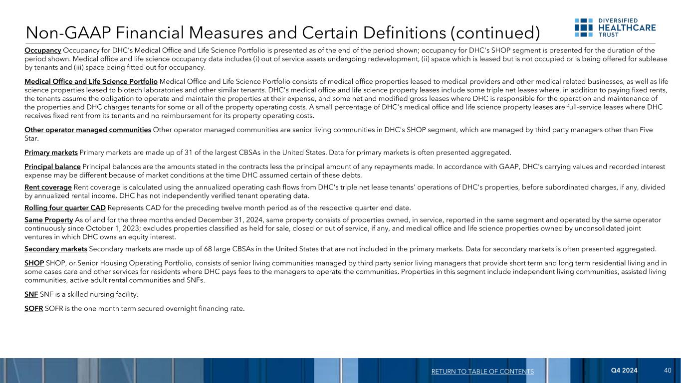 2024年第四季度,DHC的医疗办公室和生命科学组合的40名入住率显示为截至所示期间的期末;DHC的商店部分的入住率显示为所示期间的持续时间。医疗办公室和生命科学占用数据包括(i)正在进行重建的服务外资产,(ii)已出租但未被占用或由租户提供转租的空间,以及(iii)正在装修以供占用的空间。Medical Office and Life Science Portfolio Medical Office and Life Science Portfolio包括租赁给医疗提供者和其他医疗相关业务的医疗办公物业,以及租赁给生物技术实验室和其他类似租户的生命科学物业。DHC的医疗办公室和生命科学物业租赁包括部分由租户除支付固定租金外,自行承担费用运营和维护物业义务的三重净租赁,以及部分由DHC负责物业的运营和维护、DHC向租户收取部分或全部物业运营成本的三重净租赁和修改后的毛租赁。DHC的医疗办公室和生命科学物业租赁中有小比例的租赁为全服务租赁,其中DHC从租户那里获得固定租金,其物业运营成本不予报销。其他运营商管理社区其他运营商管理社区为DHC SHOP板块中的老年生活社区,由五星电器以外的第三方管理人进行管理。一级市场一级市场由美国31个最大的CBSA组成。一级市场的数据通常以汇总方式呈现。本金余额本金余额是合同中规定的金额减去任何还款的本金。根据公认会计原则,由于DHC承担其中某些债务时的市场条件,DHC的账面价值和记录的利息费用可能有所不同。租金覆盖率租金覆盖率的计算方法是,在扣除任何次级费用(如有)之前,使用DHC的三重净租赁租户对DHC的物业进行运营产生的年化经营现金流除以年化租金收入。DHC未对租户经营数据进行独立核实。滚动四季度加元代表截至相应季度结束日期的前十二个月期间的加元。同一物业截至2024年12月31日止三个月,同一物业包括自2023年10月1日起在同一分部报告及由同一营运商持续经营的拥有、在役、在同一分部报告的物业;不包括分类为持有待售、已结业或停止服务(如有)的物业,以及由未合并的合营企业拥有的医疗办公室和生命科学物业,而DHC拥有权益。二级市场二级市场由美国68家未纳入一级市场的大型CBSA组成。二级市场的数据通常是汇总呈现的。SHOP SHOP,或老年住房运营组合,由第三方高级生活经理管理的老年生活社区组成,这些社区为居民提供短期和长期居住,在某些情况下还提供护理和其他服务,在这些服务中,DHC向经理支付费用以运营社区。该细分领域的物业包括独立生活社区、辅助生活社区、活跃的成人租赁社区和SNF。SNF SNF是一家熟练的护理机构。SOFR SOFR是一个月期限有担保隔夜融资利率。Non-GAAP财务指标和某些定义(续)返回目录