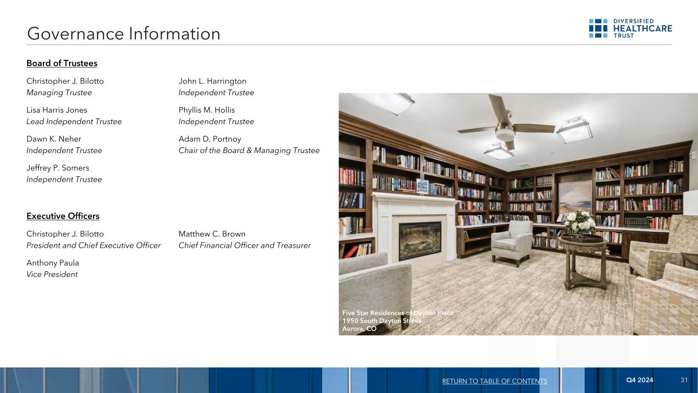 2024年第四季度31董事会Christopher J. Bilotto John L. Harrington管理受托人独立受托人Lisa Harris Jones Phyllis M. Hollis首席独立受托人独立受托人Dawn K. Neher Jeffrey P. Somers独立受托人执行官Christopher J. Bilotto Matthew C. Brown总裁兼首席执行官首席财务官和财务主管Anthony Paula治理信息副总裁返回目录Dayton Place 1950 South Dayton Street Aurora,CO