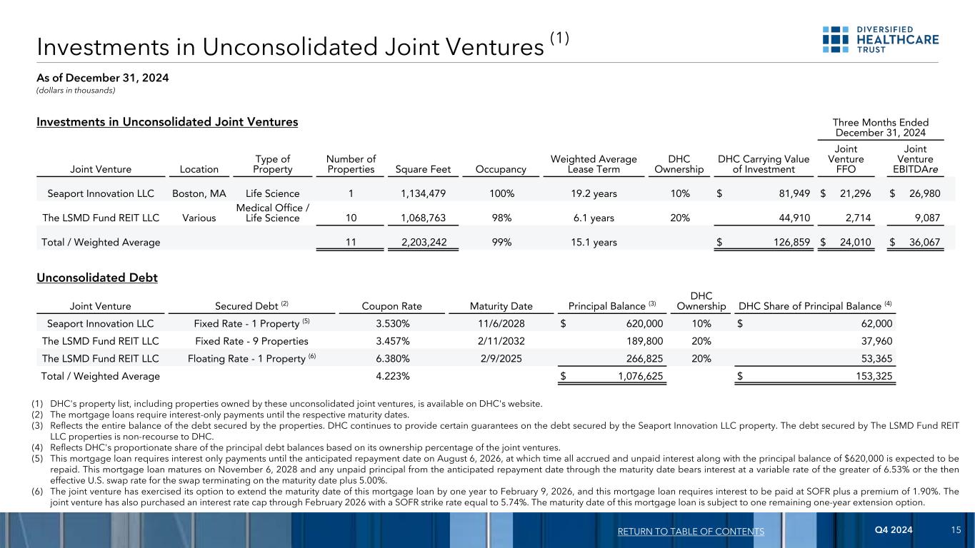 2024年第四季度15对未合并合资企业的投资(1)(单位:千美元)截至2024年12月31日止三个月的目录回报合资企业地点类型物业数量平方英尺占用权重平均租赁期限DHC所有权DHC账面价值投资合资企业FFO合资企业EBITDA是Seaport Innovation LLC波士顿,MA Life Science 11,134,479100% 19.2年10% $ 81,949 $ 21,296 $ 26,980 The LSMD Fund REIT LLC Various Medical Office/Life Science 101,068,76398% 6.1年20% 44,9102,7149,087总计/加权平均112,203,24299% 15.1年126,859美元24,010美元36,067美元投资于未合并的合资企业未合并债务合资企业有担保债务(2)票面利率到期日本金余额(3)DHC所有权丨DHC占本金余额的份额(4)Seaport Innovation LLC Fixed Rate-1 Property(5)3.530% 11/6/2028 $ 620,00010% $ 62,000 The LSMD Fund REIT LLC Fixed Rate-9 Properties 3.457% 2/11/2032189,80020% 37,960 The LSMD Fund REIT LLC Floating Rate-1 Properties(6)6.380% 2/9/2025266,82520% 53,365 Total/Weighted Average 4.223% $ 1,076,625 $ 153,325(1)DHC的财产清单,包括这些未合并的合资企业拥有的财产,可在DHC的网站上查阅。(2)按揭贷款要求只付利息,直至相应的到期日。(3)反映物业担保债务的全部余额。DHC继续为Seaport Innovation LLC财产担保的债务提供一定的担保。由LSMD Fund REIT LLC财产担保的债务对DHC无追索权。(4)反映DHC根据其在合营企业中的所有权百分比在主债务余额中所占的比例。(5)这笔抵押贷款只需要支付利息,直到2026年8月6日的预期还款日期,届时所有应计和未支付的利息以及本金余额620,000美元预计将得到偿还。这笔抵押贷款于2028年11月6日到期,从预期还款日到到期日的任何未付本金按6.53%或在到期日终止的掉期的当时有效美国掉期利率加5.00%中的较大者的浮动利率计息。(6)合营企业行使选择权,将本次抵押贷款到期日延长一年至2026年2月9日,本次抵押贷款需按SOFR加溢价1.90%支付利息。这家合资企业还购买了截至2026年2月的利率上限,SOFR执行率等于5.74%。此抵押贷款的到期日受制于一项剩余的一年展期选择权。