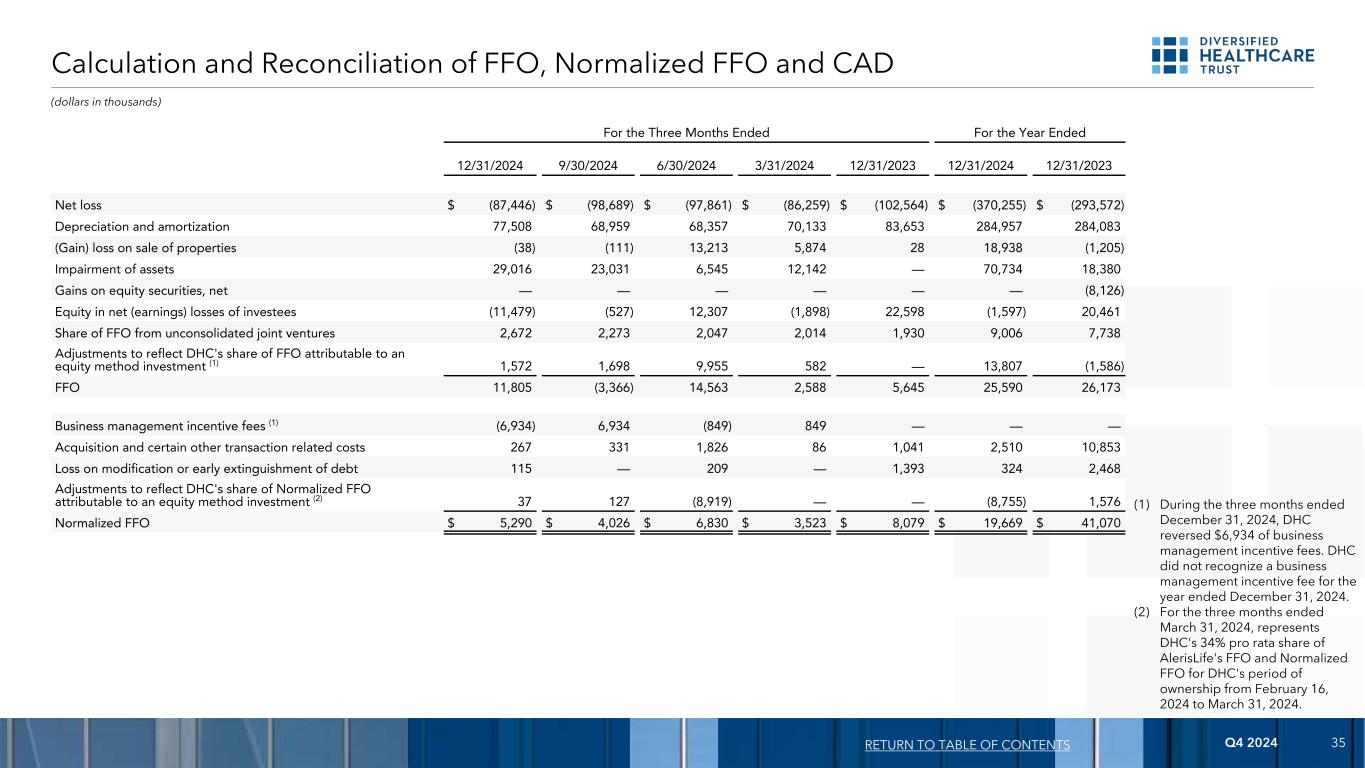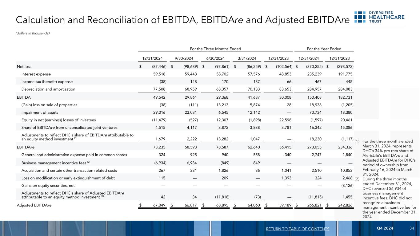 Q4 2024 34 EBITDA的计算与调节,截至12/31/20249/30/20246/30/20243/31/202412/31/202312/31/202412/31/202312/31/2023净亏损$(87,446)$(98,689)$(97,861)$(86,259)$(102,564)$(370,255)$(293,572)利息支出59,51859,44358,70257,57648,853235,239191,775所得税(收益)费用(38)14817018766467445折旧及摊销77,50868,95968,35770,13383,653284,957284,083 EBITDA 49,54229,86129,36841,63730,008150,408182,731(收益)出售物业亏损(38)(111)13,2135,8742818,938(1,205)资产减值29,01623,0316,54512,142 — 70,73418,380被投资单位净(收益)亏损中的权益(11,479)(527)12,307(1,898)22,598(1,597)20,461应占EBITDA来自未合并的合营企业4,5154,1173,8723,8383,78116,34215,086调整以反映DHC应占EBITDA的权益和以普通股支付的管理费用3249259405583402,7471,840业务管理奖励费(2)(6,934)6,934(849)849 ————收购和某些其他交易相关费用2673311,826861,0412,51010,853债务变更或提前清偿损失115 — 209 — 1,3933242,468股本证券收益,净额——————(8,126)为反映DHC在调整后EBITDA中所占份额而进行的调整归属于权益法投资(1)4234(11,818)(73)—(11,815)1,455调整后EBITDA为67,049美元66,817美元68,895美元64,060美元59,189美元266,821美元242,826美元截至2024年3月31日止三个月的目录(1),代表DHC在DHC所有权期间的EBITDA和调整后EBITDA中按比例所占的34%。(2)在截至2024年12月31日的三个月中,DHC冲回了6934美元的业务管理奖励费。DHC未就截至2024年12月31日止年度确认业务管理奖励费。
