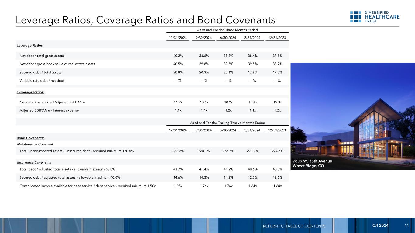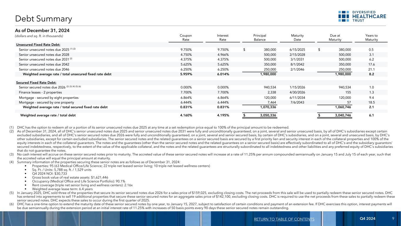 2024 Q4 10 $ 380,000 $ 500,000 $ 500,000 $ 600,000 $ 1,940 $ 941,379 $ 245 $ 261 $ 278 $ 297 $ 317 $ 338 $ 360 $ 124,921无担保固定利率债务有担保固定利率债务2025202620272028202920292030203120322033此后$ 0 $ 200,000 $ 400,000 $ 600,000 $ 800,000 $ 1,000,000债务到期时间表(1)截至2024年12月31日的目录(千美元)(1)包括截至2026年4月到期的2,338美元融资租赁债务。(2)2025年1月,DHC以159025美元的销售价格出售了为其当时于2026年到期的940534美元优先有担保票据提供担保的其中三处房产,不包括交割费用。此次出售所得款项净额将用于部分赎回这些优先担保票据。DHC已签订协议,以出售额外的19处房产,为这些优先担保票据提供担保,总销售价格为14.21万美元,不包括成交费用。DHC被要求使用这些销售的净收益来部分赎回这些优先有担保票据。DHC预计这些销售将在2025年第一季度发生。(3)在满足某些条件并支付延期费的情况下,DHC拥有将其2026年到期的优先有担保票据的到期日延长一年至2027年1月15日的一次性选择权。如果DHC行使这一选择权,则在延长期内将每半年支付一次利息,初始利率为11.25%,每90天加息50个基点,这些未偿还的优先有担保票据。(2) (3)