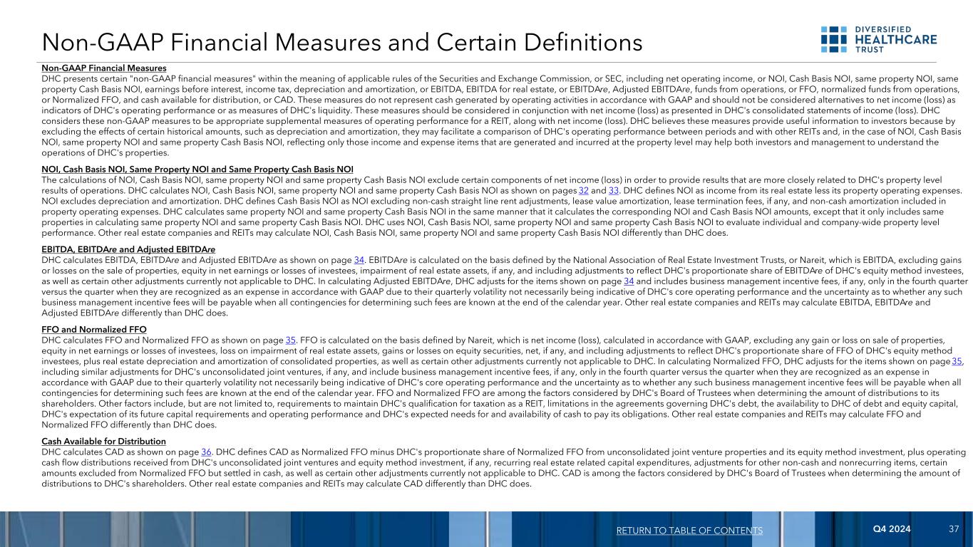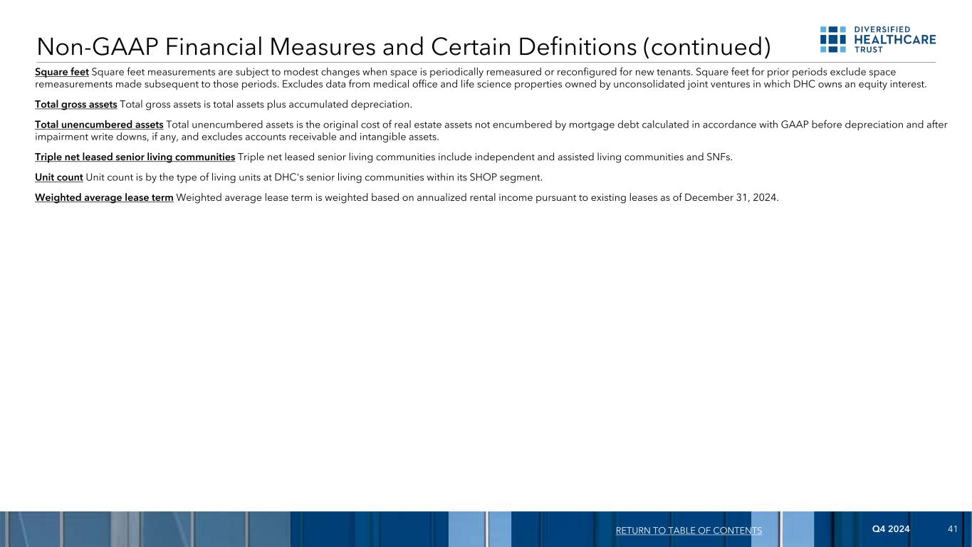 2024年第4季度38调整后总资产调整后总资产是按照公认会计原则计算的扣除折旧和减值减记(如果有的话)后的房地产资产的原始成本,不包括应收账款和无形资产。AlerisLifeAlerisLife是指AlerisLife Inc.。所有其他所有其他业务包括三重净租赁的老年生活社区和健康中心,这些社区和健康中心出租给第三方运营商,DHC从中收取租金,以及任何其他不可归属于特定报告分部的收入或费用。年化股息收益率年化股息收益率是在适用期间内宣布的年化股息除以相关期间末DHC普通股的收盘价。年化租金收入年化租金收入基于截至2024年12月31日的现有租约的租金。年化租金收入包括估计百分比租金、直线租金调整以及某些净租赁和修改后总租赁的估计经常性费用偿还,不包括租赁价值摊销。DHC的医疗办公室和生命科学物业的年化租金收入金额也不包括根据截至2024年12月31日的现有租约从未合并的合资企业拥有的医疗办公室和生命科学物业中获得的100%租金,而DHC拥有股权。平均月费率反映所示期间每个被占用单位的平均每月居民费用和服务。平均月费率是根据期间的实际天数计算得出的。建筑改进建筑改进一般包括用于更换延长现有资产使用寿命的过时建筑部件的支出或用于增加物业适销性的其他改进。业务管理奖励费业务管理奖励费是我们与RMR签订的管理协议项下的费用,应在每个自然年度结束后支付,是根据定义的普通股总回报率与MSCI美国REIT/医疗保健REIT指数在适用的计量期间的回报率进行比较计算的,并包含在DHC综合损益表的一般和行政管理中。在按照公认会计原则计算净收入(亏损)时,DHC在第一季度、第二季度和第三季度确认估计的业务管理激励费费用(如有)。尽管DHC在计算净收入(亏损)时会在第一季度、第二季度和第三季度确认这项费用(如果有的话),但是DHC要到第四季度(如果有的话)才会将这些金额包括在标准化FFO或调整后EBITDA的计算中。当时该日历年度的业务管理奖励费费用金额(如果有)已确定。现金基础NOI保证金%现金基础NOI保证金%定义为现金基础NOI占现金基础租金收入的百分比。现金制租金收入不包括非现金直线租金调整、租赁价值摊销和租赁终止费(如有)。可用于偿债的合并收入可用于偿债的合并收入是经营收益,不包括利息费用、折旧和摊销、税收、资产减值损失、股本证券损益、出售财产的损益和债务的修改或提前清偿,与适用期间的偿债一起确定。基于核心的统计区域基于核心的统计区域,或CBSA,是将区域确定为大都市或小城市或两者都不是的地理区域。管理和预算办公室在2000年定义了CBSA。CBSA在每次人口普查中使用数据和普查信息的组合进行重新分类。票面利率票面利率是指在合同条款中载明或根据合同条款确定的利率。Non-GAAP财务指标和某些定义(续)返回目录