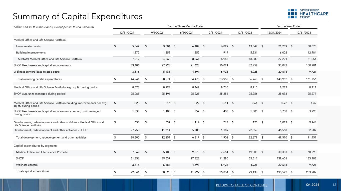 2024年Q4 14物业处置信息自2024年1月1日起处置:出售日期位置段物业数量毛销价每平方英尺或单位毛销价(1)入住率(2)3/28/2024 Phoenix,AZ Medical Office and Life Science Portfolio 1 $ 3,600 $ 28.55 100.0% 6/3/2024 Irving,TX Medical Office and Life Science Portfolio 14,200 $ 44.62 0.0% 7/22/2024 Buffalo Grove,IL Medical Office and Life Science Portfolio 16,175 $ 95.21 47.9% 7/31/2024 Eagan,MN Medical Office and Life Science Portfolio 115,100 $ 107.2365.4% 11/1/2024 Overland Park,KS Medical Office and Life Science Portfolio 16,600 $ 27.57 26.1% 1/21/2025 Wilmington,DE SHOP 12,900 $ 28,4310.0% 1/31/2025 San Diego,加利福尼亚州 Medical Office and Life Science Portfolio(3)3159,025 $ 855.07 49.2% 2/24/2025 Tempe,AZ Medical Office and Life Science Portfolio 116,800 $ 204.22 0.0%总处置10214,400美元返回目录(以千美元计,每平方英尺或单位的总销售价格除外)(1)代表医疗办公室和生命科学投资组合的每平方英尺总销售价格以及SHOP和所有其他分部的每单位总销售价格。(2)入住率呈列截至医疗办公室和生命科学组合出售日期前的月底,以及截至SHOP分部出售日期前一个月的入住率。(3)出售该等物业的所得款项净额须用于部分赎回DHC于2026年到期的优先有担保票据。(4)出售其中19项物业的所得款项净额须用于部分赎回DHC于2026年到期的优先有担保票据。DHC预计将在2025年第一季度出售这些物业,总销售价格为14.21万美元,不包括关闭费用。(5)Medical Office和Life Science Portfolio以及所有其他物业的入住率以及截至2024年12月31日止三个月的入住率,以及DHC的商店部分的入住率。根据截至2025年2月24日的协议或意向书:物业分部数量估计总销售价格每平方英尺或单位的总销售价格(1)占用(5)医疗办公室和生命科学组合(4)2 $ 12,600 $ 80.27 41.3%商店568,480 $ 95,50980.2%所有其他(4)19138,500 $ 142,34389.3%根据协议或意向书总计26 $ 219,580
