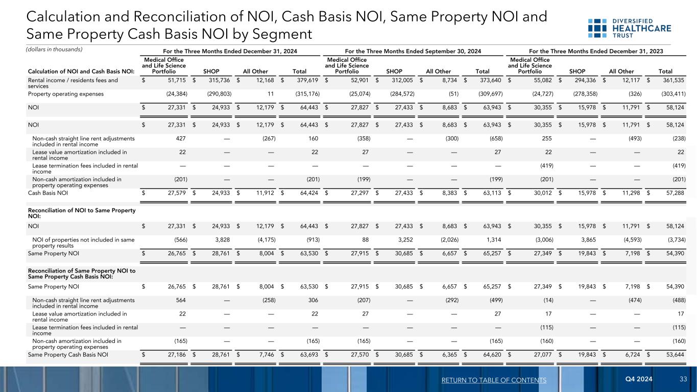 2024 Q4 33截至2024年12月31日止三个月按分部划分的NOI、现金基础NOI、相同财产NOI和相同财产现金基础NOI的计算和调节截至2024年9月30日止三个月截至12月31日止三个月的目录回报率(千美元),2023年NOI和现金基础NOI的计算:医疗办公室和生命科学组合商店所有其他总医疗办公室和生命科学组合商店所有其他总医疗办公室和生命科学组合商店所有其他总租赁收入/居民费用和服务51,715美元315,736美元12,168美元379,619美元52,901美元312,005美元8,734美元373,640美元55,082美元294,336美元12,117美元361,535美元物业运营费用(24,384)(290,803)11(315,176)(25,074)(284,572)(51)(309,697)(24,727)(278,358)(326)(303,411)NOI 27,331美元24,933美元12,179美元64,443美元27,827美元27,433美元8,683美元63,943美元30,355美元15,978美元11,791美元58,124 NOI 27,331美元24,427 —(267)160(358)—(300)(658)255 —(493)(238)计入租金收入的租赁价值摊销22 —— 2227 —— 2722 —— 22计入租金收入的租赁终止费——————————(419)————(419)计入物业经营费用的非现金摊销(201)——(201)(199)——(201)——(201)——(201)现金基础NOI 27,579美元24,933美元11,912美元64,424美元27,297美元27,433美元8,383美元63,113美元30,012美元15,978美元11,298美元57,288 NOI调节同一财产NOI:NOI 27,331美元24,933美元12,179美元64,443美元27,827美元27,433美元8,683美元63,943美元30,355美元15,978美元11,791美元58,124美元未包括在同一财产结果中的财产NOI(566)3,828(4,175)(913)883,252(2,026)1,314(3,006)3,865(4,593)(3,734)同一财产NOI 26,765美元28,761美元8,004美元63,530美元27,915美元30,685美元6,657美元65,257美元27,349美元19,843美元7,198美元54,390同一财产NOI与同一27,915美元30,685美元6,657美元65,257美元27,349美元19,843美元7,198美元54,390美元非现金直线租金调整计入租金收入564 —(258)306(207)—(292)(499)(14)—(474)(488)计入租金收入的租赁价值摊销22 —— 2227 —— 2717 —— 17计入租金收入的租赁终止费——————(115)——(115)计入物业运营费用的非现金摊销(165)——(165)——(165)——(160)——(160)相同物业现金基础NOI$ 27,186 $ 28,761 $ 7,746 $ 63,693 $ 27,570 $ 30,685 $ 6,365 $ 64,620 $ 27,077 $ 19,843 $ 6,724 $ 53,644