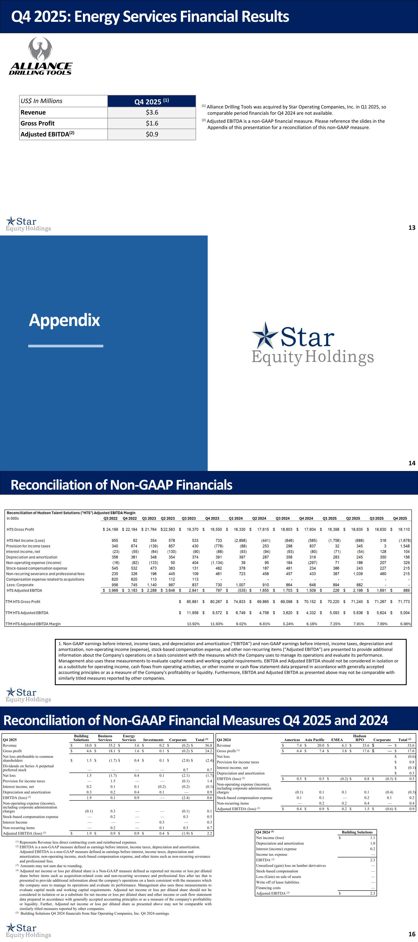 17 FY 2025 Building Solutions Business Services 美国能源服务 Investments Corporate Total(3)Revenue $ 27.6 $ 139.7 $ 4.9 $ 0.2 $(0.2)$ 172.2 Gross Profit $ 6.3 $ 71.8 $ 1.9 $ 1.9 $ 0.1 $(0.2)$ 79.9 Net loss attributable to common shareholders 1.9(2.2)0.4 0.2(6.9)$(6.7)A系列永久优先股股息———— 0.7 $ 0.7净亏损1.9(2.2)0.4 0.2(6.1)$(5.9)所得税拨备—— 2.0 —— 0.1 $ 2.1利息收入,净额0.2 0.5 0.1(0.3)(0.8)$(0.3)折旧和摊销0.41.0 0.6 0.1 — 2.1美元EBITDA(亏损)(2)$ 2.4 $ 1.4 $ 1.0 $ — $(6.9)$(2.0)营业外支出(收入),包括公司管理费用(0.1)1.6 ——(1.2)$ 0.3股票补偿费用— 0.9 —— 0.6 $ 1.5利息收入———— 0.4 — $ 0.4非经常性项目0.11.2 — 0.1 2.5 $ 4.0调整后EBITDA(亏损)(2)$ 2.5 $ 5.0 $ 1.0 $ 0.5 $(4.9)$ 4.2 FY 2024 Americas Asia Pacific EMEA Hudson RPO Corporate Total(3)Revenue $ 27.9 $ 86.7 $ 25.5 $ 140.1 $ — $ 140.1 Gross profit(1)$ 25.1 $ 29.4 $ 15.6 $ 70.2 $ — $ 70.2 Net loss $(4.8)Provision for所得税1.3利息收入净额(0.4)折旧和摊销1.4 EBITDA(亏损)(2)$ 0.3 $ 0.5 $ 0.3 $ 1.1 $(3.6)$(2.5)营业外支出(收入),包括公司管理费用0.2 0.7 0.3 1.2(1.2)—基于股票的补偿费用0.2 0.4 0.2 0.8 0.5 1.3非经常性项目0.10.8 0.3 1.2 0.9 2.1调整后EBITDA(亏损)(2)$ 0.9 $ 2.4 $ 1.0 $ 4.3 $(3.4)$ 0.9(1)代表收入减去直接承包成本和报销费用。(2)EBITDA是一种非GAAP衡量标准,定义为扣除利息、所得税、折旧和摊销前的收益。调整后EBITDA是一种非GAAP衡量标准,定义为扣除利息、所得税、折旧和摊销前的收益、营业外收入、基于股票的补偿费用以及非经常性遣散费和专业费用等其他项目。(三)因四舍五入,金额不得相加。2025财年和2024财年非公认会计准则财务指标的调节18(1)由于四舍五入,金额可能不相加。(2)调整后的每股摊薄净收益或亏损是一种非公认会计原则的衡量标准,定义为在收购相关成本和非经常性遣散费和税后专业费用等项目之前报告的每股摊薄净收益或亏损,其提出是为了根据与公司用于管理其运营和评估其业绩的衡量标准相一致的基础上提供有关公司运营的额外信息。管理层还使用这些衡量标准来评估资本需求和营运资金需求。调整后的每股摊薄净收益或亏损不应被孤立地考虑或替代根据公认会计原则编制的每股摊薄净收益或亏损以及其他收益或现金流量表数据,或作为衡量公司盈利能力或流动性的指标。此外,上述调整后的每股摊薄净收益或亏损可能无法与其他公司报告的类似标题的衡量标准进行比较。经调整净亏损(1)每股摊薄收益(1)经调整净收益(1)每股摊薄收益(1)截至3个月截至3个月截至3个月截至3个月截至2025年12月31日2025年12月31日2025年12月31日2024年12月31日,2024年净亏损$(1.7)$(0.48)$(0.6)$(0.20)A系列永续优先股股息(0.7)(0.19)——归属于普通股股东的净亏损(2.4)(0.67)(0.6)(0.20)收购产生的无形摊销0.2 0.05 0.3 0.09子公司减记的递延税1.1 0.31 ——非经常性项目(税后)0.7 0.2 10.4 0.15调整后归属于普通股股东的净利润(亏损)(2)$(0.3)$(0.10)$ 0.1 $ 0.04非公认会计原则财务措施第四季度和2025财年的调节及2024年经调整净亏损(1)每股摊薄股份(1)经调整净亏损(1)每股摊薄股份(1)截至年底止年度截至2025年12月31日止年度2025年12月31日止年度2024年12月31日止年度,2024年净亏损$(5.9)$(1.85)$(4.8)$(1.59)A系列永久优先股股息(0.8)(0.23)——归属于普通股股东的净亏损(6.7)(2.08)(4.8)(1.59)收购产生的无形摊销0.9 0.28 1.1 0.38子公司减记的递延税项1.1 0.35 ——非经常性项目(税后)4.01.25 2.2 0.73调整后归属于普通股股东的净利润(亏损)(2)$(0.6)$(0.20)$(1.5)$(0.49)19财年2025年度建筑解决方案业务服务美国能源服务投资公司合计(3)备考收入, 来自外部客户(1)$ 71.9 $ 139.7 $ 13.2 $ 0.6 $(0.6)$ 224.7备考毛利(1)$ 18.0 $ 71.8 $ 5.5 $ 0.3 $(0.6)$ 95.0备考归属于普通股股东的净亏损(1)$ 3.5 $(2.2)$ 0.7 $ 5.1 $(13.6)$(6.6)A系列永久优先股股息———— 2.5 2.5备考净亏损3.5(2.2)0.75.1(11.1)(4.1)所得税拨备—— 2.0 ——(1.7)0.3利息收入,净额0.7 0.5 0.2(0.7)(0.8)(0.1)折旧和摊销2.8 1.0 1.4 0.3 — 5.6 EBITDA(亏损)(2)7.0 1.4 2.34.7(13.5)1.8营业外支出(收入),包括公司管理费用(0.1)1.6 ——(1.2)0.3股票补偿费用—— 0.9 —— 0.8 1.7利息收入———— 1.2 —— 1.2非经常性项目0.2 1.2 0.6 1.2 4.37.6备考调整后EBITDA(亏损)(2)$ 7.2 $ 5.0 $ 2.9 $ 7.1 $(9.6)$ 12.6 2024财年建筑解决方案业务服务美国能源服务投资公司合计(3)备考收入,来自外部客户(1)$ 60.1 $ 140.1 $ 10.1 $ 0.7 $(0.7)$ 210.3备考毛利(1)$ 14.0 $ 70.2 $ 5.7 $ 0.5 $(0.7)$ 89.6归属于普通股股东的备考净亏损(1)$ 0.6 $(2.0)$ 1.4 $(1.8)$(11.9)$(13.7)A系列永久优先股股息———— 2.0 2.0备考净亏损0.6(2.0)1.4(1.8)(9.8)(11.7)所得税拨备—— 1.2 —— 0.3 1.6利息收入,净额0.5 0.5 —(0.7)(1.3)(1.0)折旧和摊销3.4 1.4 0.6 0.2 0.15.7 EBITDA(亏损)(2)4.5 1.1 2.0(2.3)(10.8)(5.5)营业外支出(收入),包括公司管理费用—— 1.2 ——(1.2)(0.1)股票补偿费用—— 0.8 —— 0.7 1.5利息收入—— 1.3 —— 1.3非经常性项目0.7 1.2 0.1 2.9 2.27.1备考调整后EBITDA(亏损)(2)5.3美元4.3美元2.1美元1.8美元(9.1)4.4美元(1)2025年全年的备考建筑解决方案和投资业绩,而不是2025年8月22日至2025年12月31日。备考美国能源服务反映Alliance Drilling Tools在2025年全年的业绩。Alliance Drilling Tools于2025年3月3日被Star Operating Companies收购。备考建筑解决方案反映了Timber Technologies在2024年全年的业绩。Timber Technologies于2024年5月17日被Star Operating Companies收购。(2)EBITDA是一种非GAAP衡量标准,定义为扣除利息、所得税、