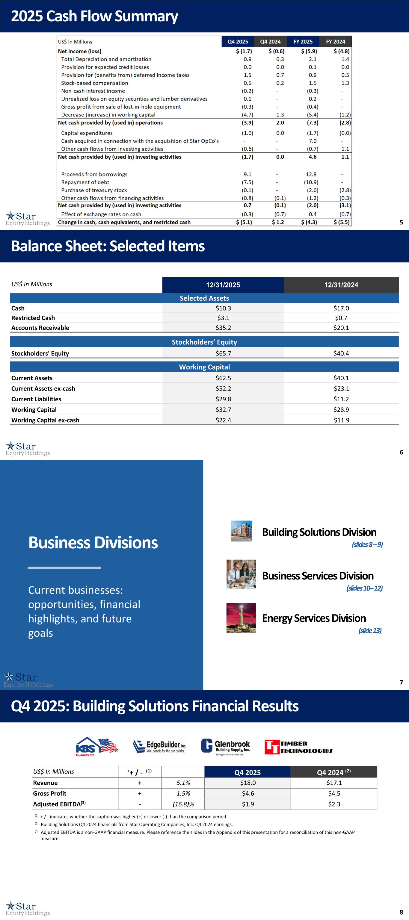 1一家多元化控股公司www.starequity.com通过有机增长、收购和股票回购创造股东价值2025年第四季度财报电话会议2025年3月18日普通股:纳斯达克:STRR A系列10%优先股:纳斯达克:STRP 2根据1995年《私人证券诉讼改革法案》的“安全港”声明:本演示文稿包含公司认为属于经修订的1933年《证券法》第27A条、经修订的1934年《证券交易法》第21E条含义内的“前瞻性声明”的声明,以及1995年《私人证券诉讼改革法案》。本新闻稿中除历史事实陈述外的所有陈述,包括有关公司未来财务状况、经营业绩、业务运营和业务前景的陈述,均为前瞻性陈述。“预期”、“估计”、“预期”、“项目”、“打算”、“计划”、“预测”、“相信”等词语以及类似的词语、表达方式以及这些词语和表达方式的变体旨在识别前瞻性陈述。所有前瞻性陈述都受制于重要因素、风险、不确定性和假设,包括可能导致实际结果与前瞻性陈述中描述的结果存在重大差异的行业和经济状况。此类因素、风险、不确定性和假设包括但不限于:(1)全球经济波动,(2)商品、材料和设备的成本和可用性变化,(3)与向客户提供不间断服务相关的风险,(4)客户随时终止与公司关系的能力,(5)与房地产所有权相关的风险,(6)公司成功实现其战略举措的能力,(7)与公司经营业绩季度间波动相关的风险,(8)与公司潜在收购或处置业务相关的风险,(9)我们的盈利能力和增长与我们经营业务的成功挂钩,(10)与我们对其他业务的财务投资相关的风险,(11)我们改进现有产品和服务以及成功开发、引进和营销新产品和服务的能力,(12)我们与公司任何最大客户的业务的损失或实质性减少,(13)公司市场的竞争,(14)与产品需求的潜在下降相关的风险,(15)我们将成本维持在可接受水平的能力,(16)未来可能再次出现的负现金流和经营亏损,(17)与国际业务相关的风险,包括外汇波动、政治事件、贸易战、自然灾害或健康危机,包括俄乌战争,以及中东地区的潜在冲突,(18)与未来信贷便利可能如何影响或限制我们的经营灵活性相关的风险,(19)我们产生或借入足够现金以支付我们的债务的能力,(20)与债务相关的风险,(21)与公司投资战略相关的风险,(22)公司对关键管理人员的依赖,(23)公司吸引和留住高技能专业人士、管理层和顾问的能力,(24)公司催收应收账款的能力,(25)公司面临的法律诉讼、调查和纠纷以及相关保险范围的限制,(26)公司利用净经营亏损结转的能力,(27)商誉减值的可能性,(28)公司股价的波动性,(29)与我们处于历史低位的交易量相关的风险,(30)与证券或行业分析师相关的风险,(31)公司宣布股息的能力,(32)与我们的A系列优先股未能支付股息相关的风险,(33)我们的年度净亏损历史,(34)与我们的国际业务相关的风险,(35)与遵守联邦和州法律、法规和其他规则相关的风险,(36)我们面临与雇佣相关的索赔、法律责任以及来自客户、员工和监管机构的成本,(37)与实施许可或税收要求或新法规相关的风险,(38)我们组织文件中的反收购条款的影响,(39)我们重述的公司注册证书中包含的保护性修订的影响,(40)我们的股东权利计划或“毒丸”的影响,关于股东决策,(41)与我们作为规模较小的报告公司的规模化披露要求相关的风险,(42)与不断演变的ESG和DEI规则和法规相关的风险,(43)公司严重依赖信息系统以及可能丢失或未能开发技术的影响,(44)网络安全威胁和攻击的不利影响, (45)与使用新的和不断发展的技术有关的风险,以及(46)“公司截至2025年12月31日止年度的10-K表格年度报告中的风险因素”中所述的风险。上述清单不应被解释为详尽无遗。实际结果可能与本新闻稿中包含的前瞻性陈述存在重大差异。鉴于这些不确定性,您不应过分依赖任何基于我们当前预期的前瞻性陈述。这份报告反映了管理层截至报告日期的观点。所有前瞻性陈述必然只是对未来结果的估计,无法保证实际结果不会与预期产生重大差异,因此,请注意不要过分依赖此类陈述。此外,任何前瞻性陈述仅代表作出之日的情况,我们不承担更新任何前瞻性陈述以反映作出陈述之日之后的事件或情况或反映意外事件发生的义务。前瞻性陈述3 Q4 2025:合并财务业绩百万美元,EPS除外' +/-(1)2025年Q4 2024年Q4收入+ 69% $ 56.8 $ 33.6毛利润+ 38% $ 24.2 $ 17.6调整后SG & A(2)(3)+ 37% $ 22.9 $ 16.7调整后EBITDA(4)+ 156% $ 2.2 $ 0.9归属于普通股股东的净利润(亏损)-(307)% $(2.4)$(0.6)归属于普通股股东的调整后净利润(亏损)-(415)% $(0.3)$ 0.1归属于普通股股东的稀释后每股收益-(235)% $(0.67)$(0.20)调整后归属于普通股股东的稀释后每股收益(4)-(350)% $(0.10)$ 0.04(1)+/-表示标题是否高于(+)或低于(-)比较期间。(2)不包括截至2025年12月31日和2024年12月31日止三个月的股票补偿费用分别为0.5百万美元和0.2百万美元。(3)截至2025年12月31日及2024年12月31日止三个月,SG & A不包括非经常性开支,分别为0.6百万元及0.4百万元。(4)调整后EBITDA、调整后净利润、调整后摊薄EPS为非GAAP财务指标。请参考本演示文稿的附录,了解这些非公认会计原则措施的对账情况。42025财年:合并财务业绩百万美元,EPS除外' +/-(1)2025财年(2)2024财年营收+ 23% $ 172.2 $ 140.1毛利+ 14% $ 79.9 $ 70.2调整后SG & A(3)(4)+ 11% $ 77.0 $ 69.2调整后EBITDA(5)+ 364% $ 4.2 $ 0.9备考调整后EBITDA(5)(6)+ 186% $ 12.6 $ 4.4归属于普通股股东的净利润(亏损)-(40)% $(6.7)$(4.8)归属于普通股股东的调整后净利润(亏损)(5)+ 56