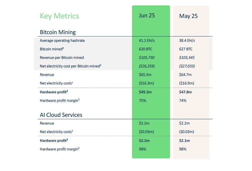 比特币挖矿和AI云服务的硬件利润率计算为收入减去净电力成本,除以收入(针对每个相应的收入流),并不包括所有其他成本。