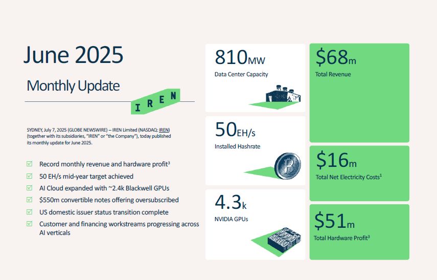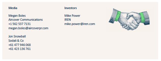 说明性年化硬件利润=说明性年化采矿收入减去假定的净电力成本。来源:CoinWarz比特币挖矿计算器。说明性计算和输入假设硬件运行在100%正常运行时间、3.5c/kWh净电力成本、3.125BTC区块奖励、0.1BTC交易费、0.16%池费、765MW功耗、10.5万美元比特币价格、50EH/s运行算力和837EH/s网络算力。说明性年化硬件利润仅用于说明目的,不应被视为对IREN经营业绩的预测。输入是基于假设,包括历史信息,未来很可能会有所不同,用户应该输入自己的假设。无法保证在所提供的时间范围内或根本无法实现任何说明性输出,也无法保证采矿硬件将以100%正常运行时间运行。应严格结合本新闻稿中的前瞻性陈述免责声明阅读上述内容。
