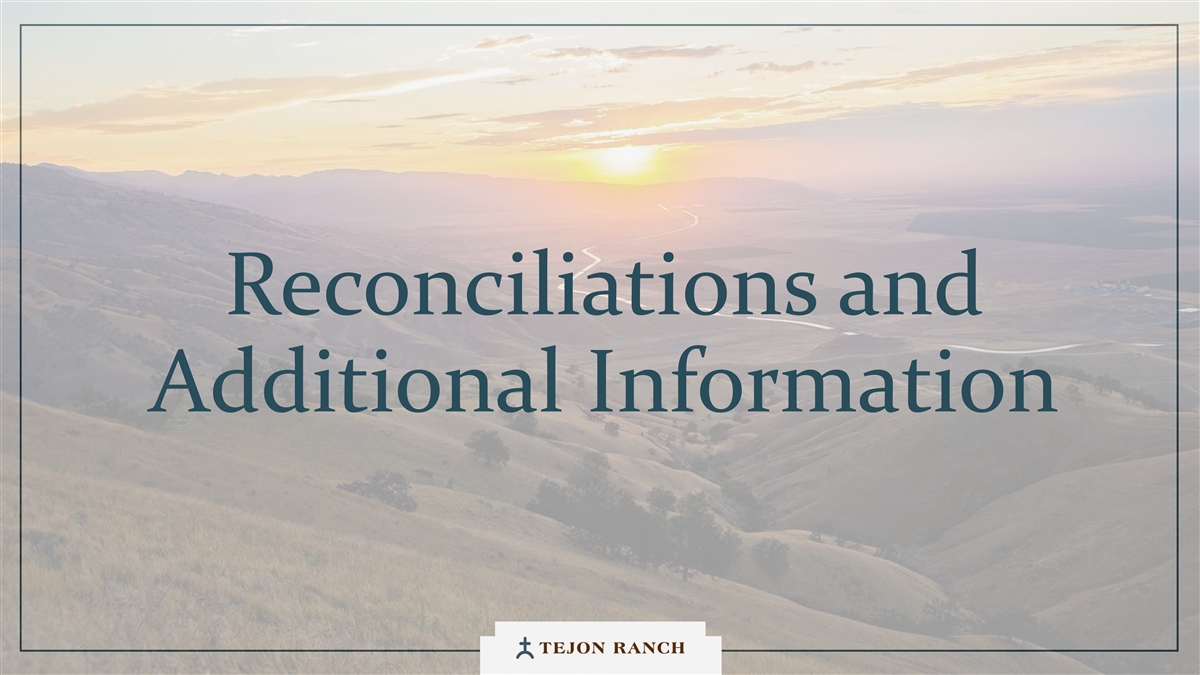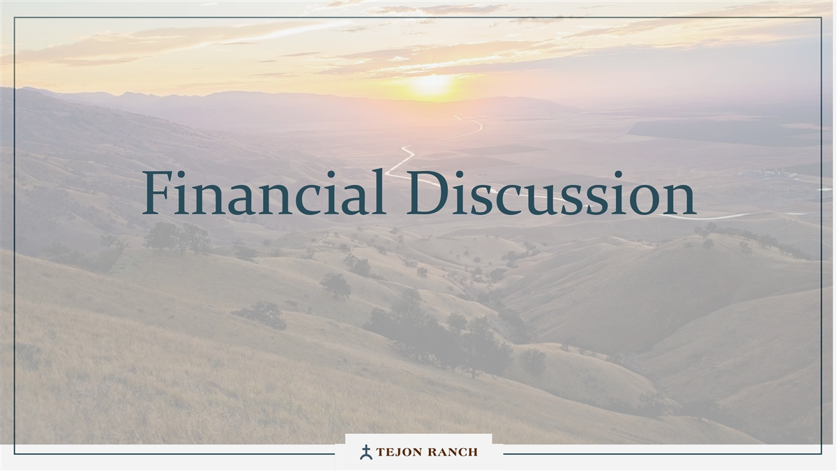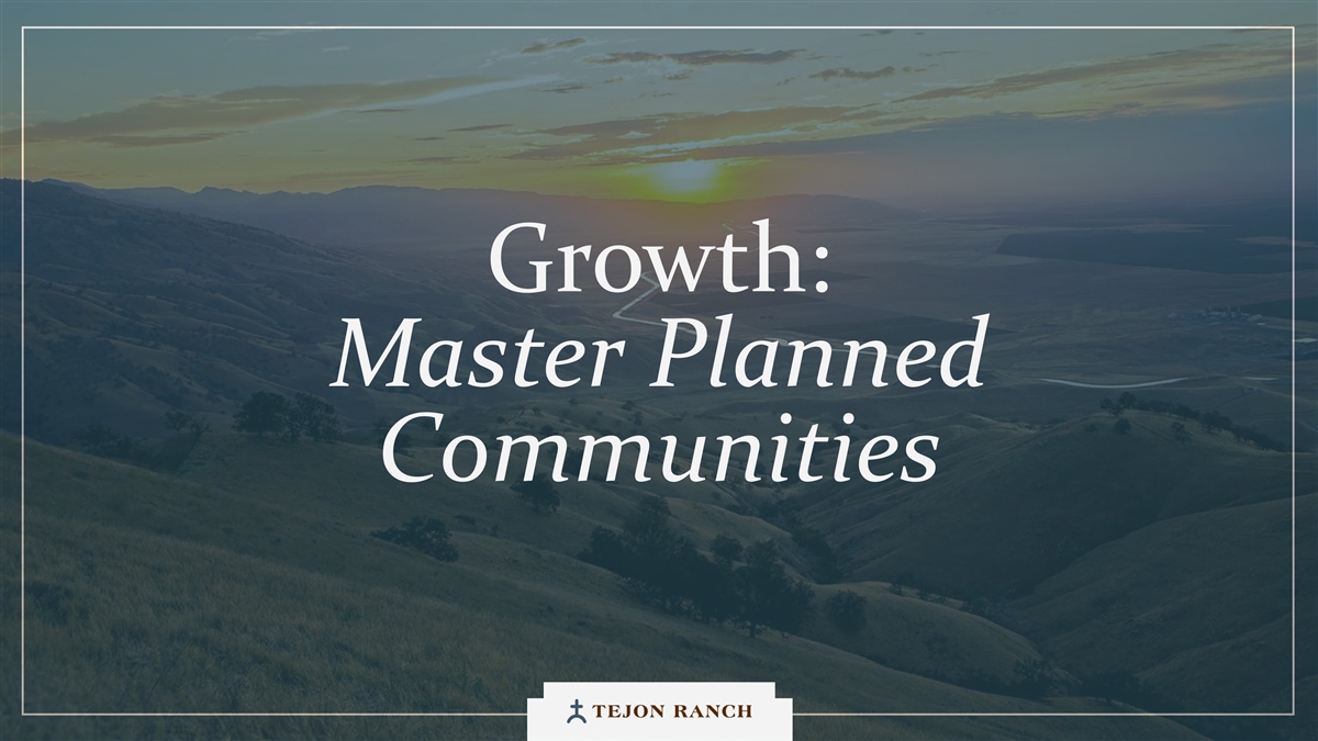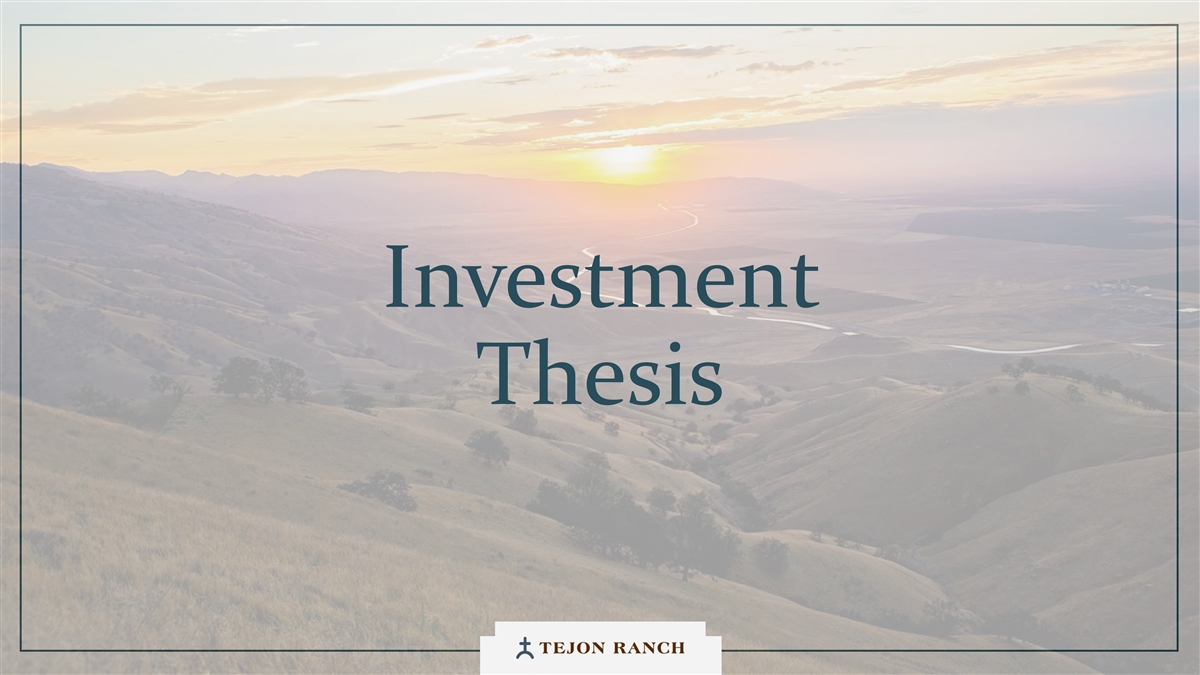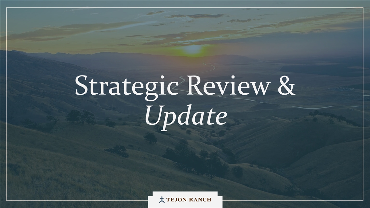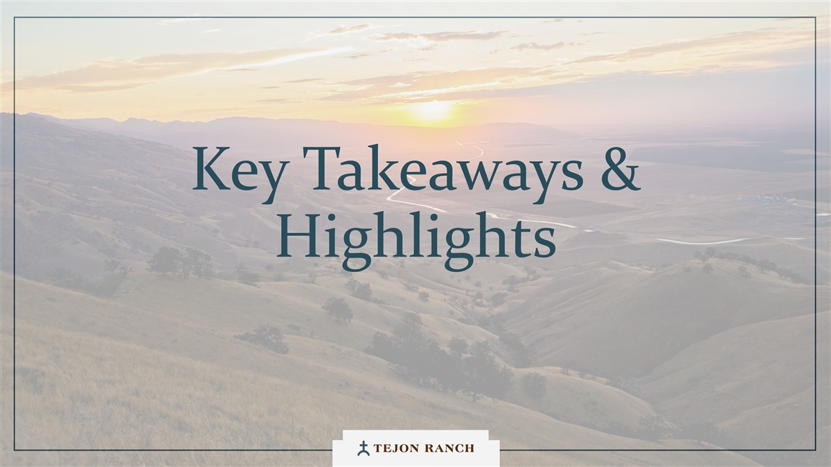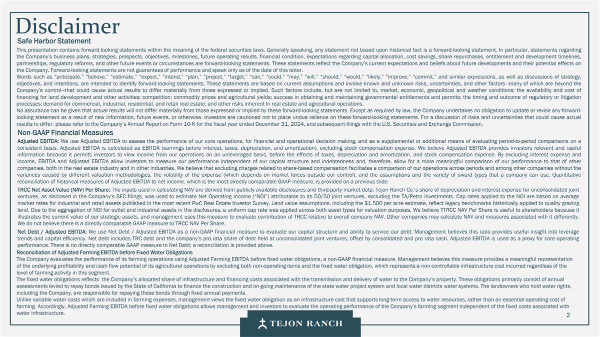 免责声明安全港声明本演示文稿包含联邦证券法含义内的前瞻性声明。一般来说,任何不以历史事实为依据的陈述都是前瞻性陈述。特别是,有关公司业务计划、战略、前景、目标、里程碑、未来经营业绩、财务状况、对资本分配的预期、成本节约、股票回购、权利和发展时间表、伙伴关系、监管改革以及其他未来事件或情况的陈述均为前瞻性陈述。这些陈述反映了公司目前对未来发展的期望和信念及其对公司的潜在影响。前瞻性陈述不是业绩的保证,仅在本函发布之日发表。“预期”、“相信”、“估计”、“预期”、“打算”、“计划”、“项目”、“目标”、“可以”、“可能”、“将”、“应该”、“将”、“可能”、“改善”、“承诺”等词语和类似表述,以及对战略、目标和意图的讨论,旨在识别前瞻性陈述。这些陈述基于当前的假设,涉及已知和未知的风险、不确定性和其他因素——其中许多因素超出了公司的控制范围——可能导致实际结果与明示或暗示的结果存在重大差异。这些因素包括但不限于市场、经济、地缘政治和天气条件;土地开发和其他活动融资的可得性和成本;竞争;商品价格和农业产量;成功获得和维持政府的权利和许可;监管或诉讼程序的时机和结果;对商业、工业、住宅和零售房地产的需求;以及房地产和农业经营固有的其他风险。无法保证实际结果不会与这些前瞻性陈述明示或暗示的结果存在重大差异。除法律要求外,公司不承担因新信息、未来事件或其他原因而更新或修改任何前瞻性陈述的义务。投资者被告诫不要过分依赖这些前瞻性陈述。有关可能导致实际结果不同的风险和不确定性的讨论,请参阅公司截至2024年12月31日的财政年度的10-K表格年度报告,以及随后向美国证券交易委员会提交的文件。非GAAP财务指标调整后EBITDA:我们使用调整后EBITDA来评估我们核心业务的业绩,用于财务和运营决策,并作为在一致基础上评估期间比较的补充或额外手段。调整后EBITDA按EBITDA(息税折旧摊销前利润)计算,不包括股票补偿费用。我们认为,调整后的EBITDA为投资者提供了相关和有用的信息,因为它允许投资者在无杠杆的基础上查看我们运营的收入,而不包括税收、折旧和摊销以及股票补偿费用的影响。通过排除利息支出和收入,EBITDA和调整后EBITDA使投资者能够独立于我们的资本结构和债务来衡量我们的业绩,因此,我们可以与其他公司的业绩进行更有意义的比较,无论是在房地产行业还是在其他行业。我们认为,排除与基于股份的薪酬相关的费用有助于比较我们在不同期间和其他公司之间的运营,而不会出现不同估值方法导致的差异、费用的波动性(这取决于我们无法控制的市场力量)以及公司可以使用的假设和奖励类型的多样性。上一张幻灯片提供了调整后EBITDA与净收入的历史衡量标准的量化对账,这是最直接可比的GAAP衡量标准。TRCC每股资产净值(NAV):用于计算NAV的输入数据来自公开披露和第三方市场数据。正如公司提交给美国证券交易委员会的文件所披露的,Tejon Ranch Co.在未合并合资企业的折旧和利息费用中所占份额用于估计归属于其50/50合资企业的净营业收入(“NOI”),不包括TA/Petro投资。适用于NOI的上限利率基于普华永道房地产投资者调查中公布的工业和零售资产的平均市场利率。土地价值假设,包括每英亩1500美元的估计,反映了历史上适用于优质牧场的遗留基准。由于在披露中对奥特莱斯和工业资产的NOI进行了汇总, 出于估值目的,对两种资产类型适用了统一的上限率。我们认为TTRCC每股NAV对股东有用,因为它说明了我们战略资产的当前价值,管理层使用这一衡量标准来评估TRCC相对于整体公司NAV的贡献。其他公司可能会以不同的方式计算NAV和与之相关的衡量标准。我们认为没有与TRCC每股NAV直接可比的GAAP衡量标准。净债务/调整后EBITDA:我们使用净债务/调整后EBITDA作为非公认会计准则财务指标来评估我们的资本结构和偿债能力。管理层认为,这一比率提供了对杠杆趋势和资本效率的有用洞察。净债务包括TRC债务和公司在未合并的合资企业持有的按比例应占债务,由合并和按比例现金抵消。调整后EBITDA被用作核心经营业绩的代表。没有与净债务直接可比的GAAP衡量标准;上面提供了对账。调整后的农业EBITDA在固定水义务之前的调节公司使用调整后的农业EBITDA在固定水义务之前评估其农业运营的业绩,这是一种非公认会计准则财务指标。管理层认为,这一衡量标准通过排除非经营性项目和固定用水义务,有意义地反映了其农业业务的基本盈利能力和现金流潜力,后者代表了无论该部门的农业活动水平如何都产生的不可控制的基础设施成本。固定用水义务反映了公司分配的与向公司财产输送和输送水相关的基础设施和融资成本的份额。这些义务主要包括为偿还加利福尼亚州发行的债券而征收的年度评估,这些债券用于为州水项目系统和当地水区水系统的建设和持续维护提供资金。持有水权的土地所有者,包括公司,有责任通过每年固定的付款来偿还这些债券。与计入耕作费用的可变用水成本不同,管理层将固定用水义务视为支持长期获得水资源的基础设施成本,而不是耕作的基本运营成本。因此,在固定水义务之前调整后的农业EBITDA允许管理层和投资者独立于与水基础设施相关的固定成本评估公司农