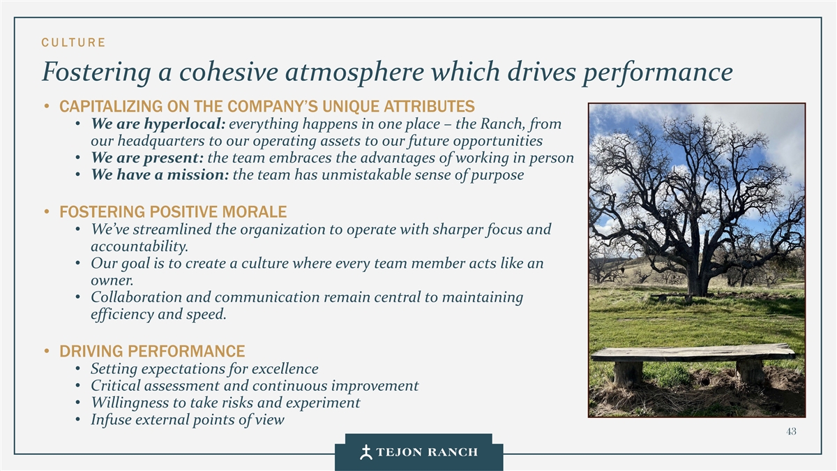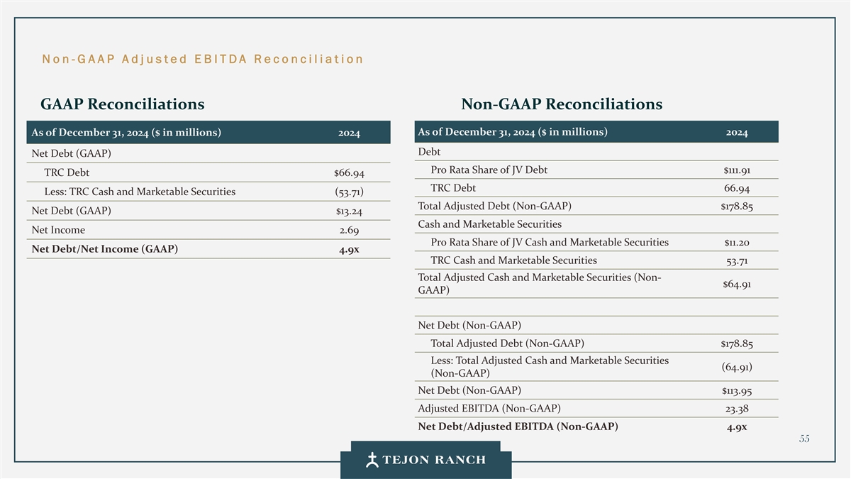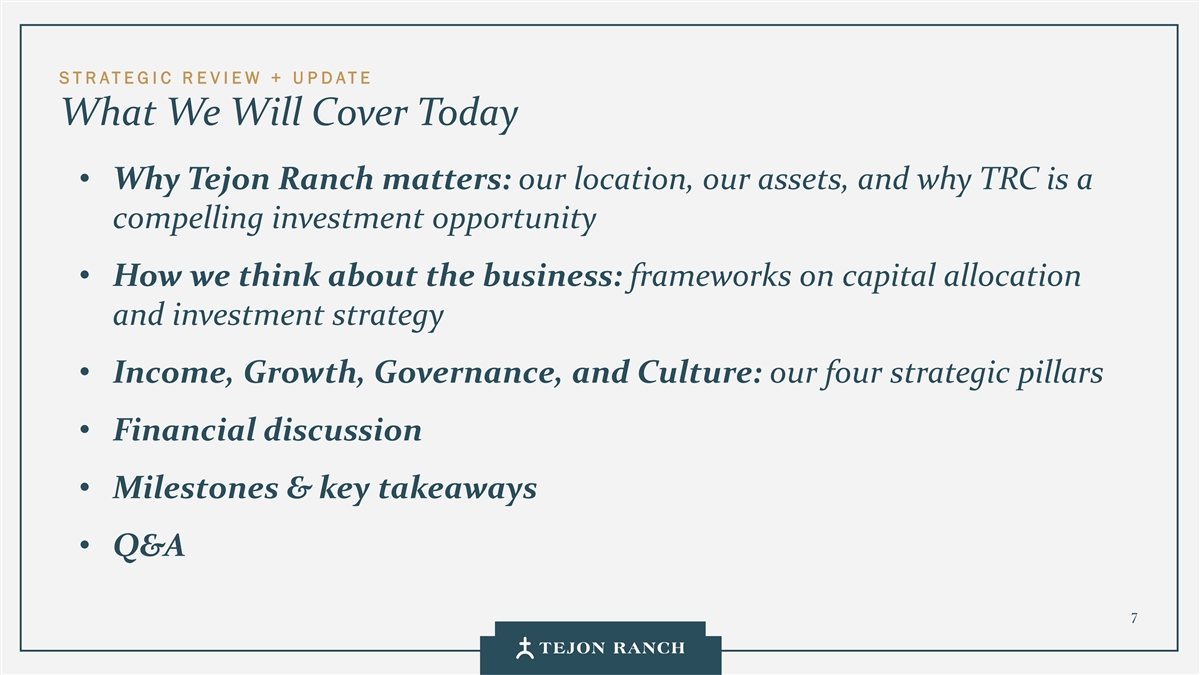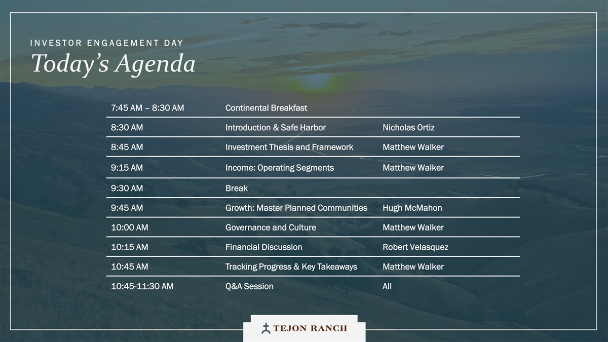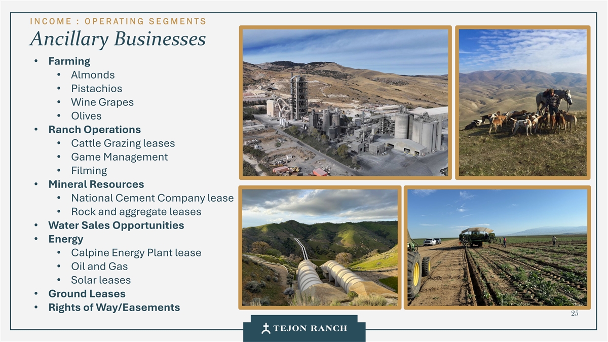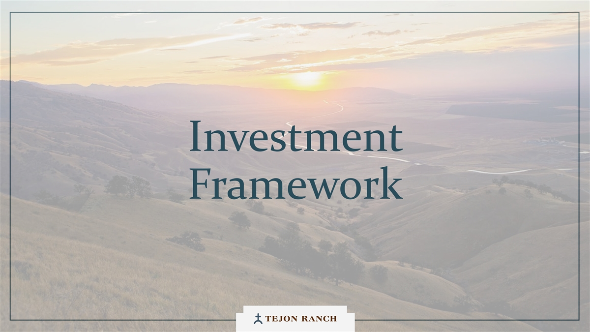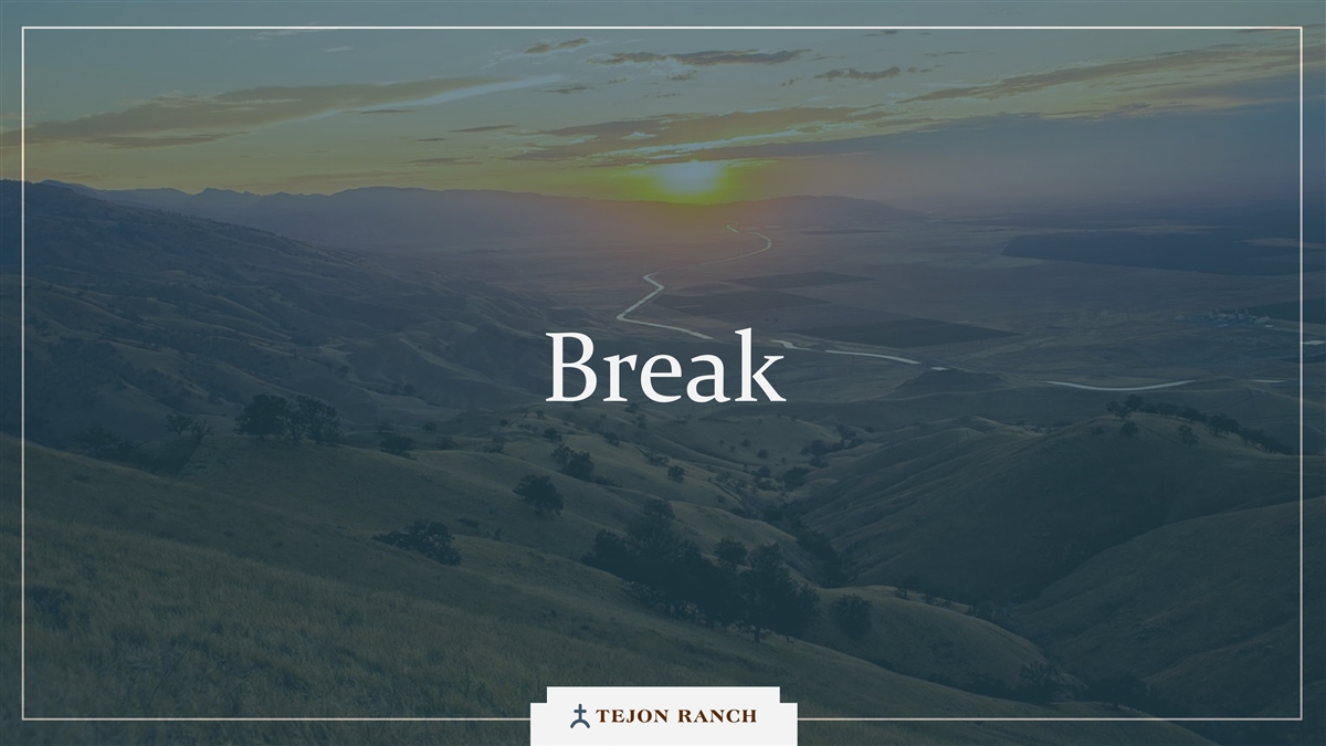 免责声明安全港声明本演示文稿包含联邦证券法含义内的前瞻性声明。一般来说,任何不以历史事实为依据的陈述都是前瞻性陈述。特别是,有关公司业务计划、战略、前景、目标、里程碑、未来经营业绩、财务状况、对资本分配的预期、成本节约、股票回购、权利和发展时间表、伙伴关系、监管改革以及其他未来事件或情况的陈述均为前瞻性陈述。这些陈述反映了公司目前对未来发展的期望和信念及其对公司的潜在影响。前瞻性陈述不是业绩的保证,仅在本函发布之日发表。“预期”、“相信”、“估计”、“预期”、“打算”、“计划”、“项目”、“目标”、“可以”、“可能”、“将”、“应该”、“将”、“可能”、“改善”、“承诺”等词语和类似表述,以及对战略、目标和意图的讨论,旨在识别前瞻性陈述。这些陈述基于当前的假设,涉及已知和未知的风险、不确定性和其他因素——其中许多因素超出了公司的控制范围——可能导致实际结果与明示或暗示的结果存在重大差异。这些因素包括但不限于市场、经济、地缘政治和天气条件;土地开发和其他活动融资的可得性和成本;竞争;商品价格和农业产量;成功获得和维持政府的权利和许可;监管或诉讼程序的时机和结果;对商业、工业、住宅和零售房地产的需求;以及房地产和农业经营固有的其他风险。无法保证实际结果不会与这些前瞻性陈述明示或暗示的结果存在重大差异。除法律要求外,公司不承担因新信息、未来事件或其他原因而更新或修改任何前瞻性陈述的义务。投资者被告诫不要过分依赖这些前瞻性陈述。有关可能导致实际结果不同的风险和不确定性的讨论,请参阅公司截至2024年12月31日的财政年度的10-K表格年度报告,以及随后向美国证券交易委员会提交的文件。非GAAP财务指标调整后EBITDA:我们使用调整后EBITDA来评估我们核心业务的业绩,用于财务和运营决策,并作为在一致基础上评估期间比较的补充或额外手段。调整后EBITDA按EBITDA(息税折旧摊销前利润)计算,不包括股票补偿费用。我们认为,调整后的EBITDA为投资者提供了相关和有用的信息,因为它允许投资者在无杠杆的基础上查看我们运营的收入,而不包括税收、折旧和摊销以及股票补偿费用的影响。通过排除利息支出和收入,EBITDA和调整后EBITDA使投资者能够独立于我们的资本结构和债务来衡量我们的业绩,因此,我们可以与其他公司的业绩进行更有意义的比较,无论是在房地产行业还是在其他行业。我们认为,排除与基于股份的薪酬相关的费用有助于比较我们在不同期间和其他公司之间的运营,而不会出现不同估值方法导致的差异、费用的波动性(这取决于我们无法控制的市场力量)以及公司可以使用的假设和奖励类型的多样性。上一张幻灯片提供了调整后EBITDA与净收入的历史衡量标准的量化对账,这是最直接可比的GAAP衡量标准。TRCC每股资产净值(NAV):用于计算NAV的输入数据来自公开披露和第三方市场数据。正如公司提交给美国证券交易委员会的文件所披露的,Tejon Ranch Co.在未合并合资企业的折旧和利息费用中所占份额用于估计归属于其50/50合资企业的净营业收入(“NOI”),不包括TA/Petro投资。适用于NOI的上限利率基于普华永道房地产投资者调查中公布的工业和零售资产的平均市场利率。土地价值假设,包括每英亩1500美元的估计,反映了历史上适用于优质牧场的遗留基准。由于在披露中对奥特莱斯和工业资产的NOI进行了汇总, 出于估值目的,对两种资产类型适用了统一的上限率。我们认为TTRCC每股NAV对股东有用,因为它说明了我们战略资产的当前价值,管理层使用这一衡量标准来评估TRCC相对于整体公司NAV的贡献。其他公司可能会以不同的方式计算NAV和与之相关的衡量标准。我们认为没有与TRCC每股NAV直接可比的GAAP衡量标准。净债务/调整后EBITDA:我们使用净债务/调整后EBITDA作为非公认会计准则财务指标来评估我们的资本结构和偿债能力。管理层认为,这一比率提供了对杠杆趋势和资本效率的有用洞察。净债务包括TRC债务和公司在未合并的合资企业持有的按比例应占债务,由合并和按比例现金抵消。调整后EBITDA被用作核心经营业绩的代表。没有与净债务直接可比的GAAP衡量标准;上面提供了对账。调整后的农业EBITDA在固定水义务之前的调节公司使用调整后的农业EBITDA在固定水义务之前评估其农业运营的业绩,这是一种非公认会计准则财务指标。管理层认为,这一衡量标准通过排除非经营性项目和固定用水义务,有意义地反映了其农业业务的基本盈利能力和现金流潜力,后者代表了无论该部门的农业活动水平如何都产生的不可控制的基础设施成本。固定用水义务反映了公司分配的与向公司财产输送和输送水相关的基础设施和融资成本的份额。这些义务主要包括为偿还加利福尼亚州发行的债券而征收的年度评估,这些债券用于为州水项目系统和当地水区水系统的建设和持续维护提供资金。持有水权的土地所有者,包括公司,有责任通过每年固定的付款来偿还这些债券。与计入耕作费用的可变用水成本不同,管理层将固定用水义务视为支持长期获得水资源的基础设施成本,而不是耕作的基本运营成本。因此,在固定水义务之前调整后的农业EBITDA允许管理层和投资者独立于与水基础设施相关的固定成本评估公司农