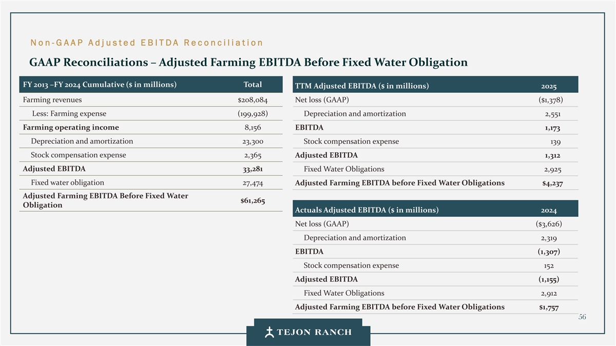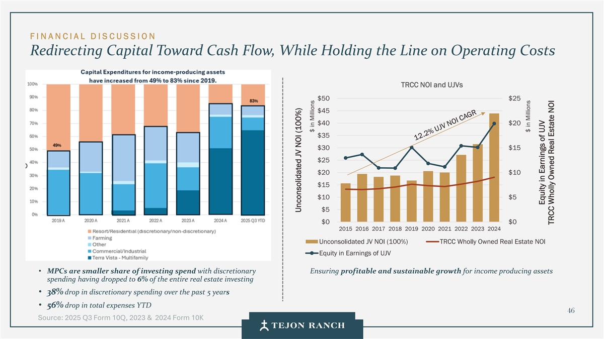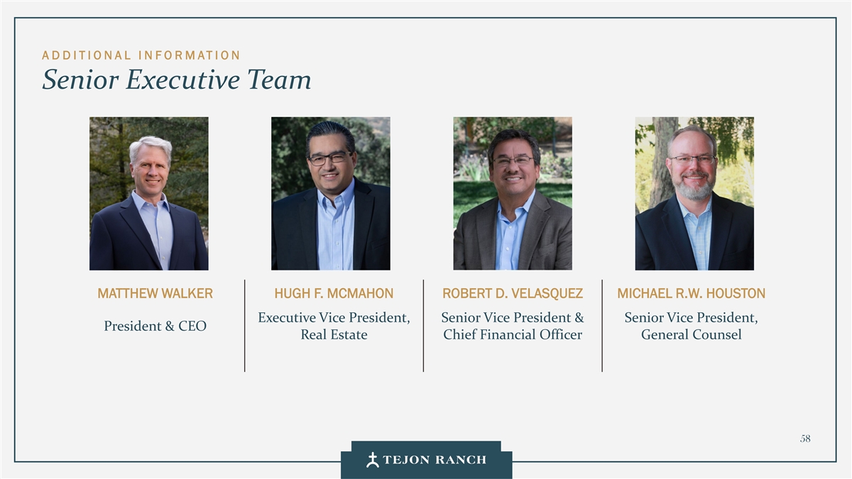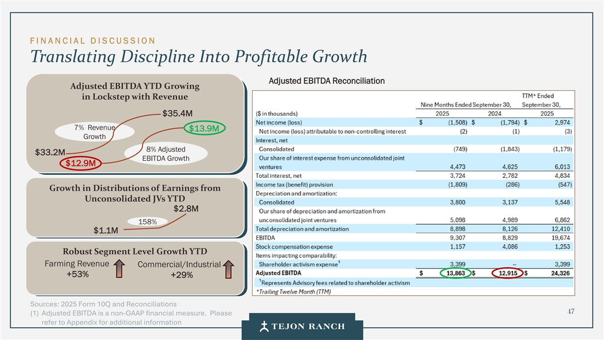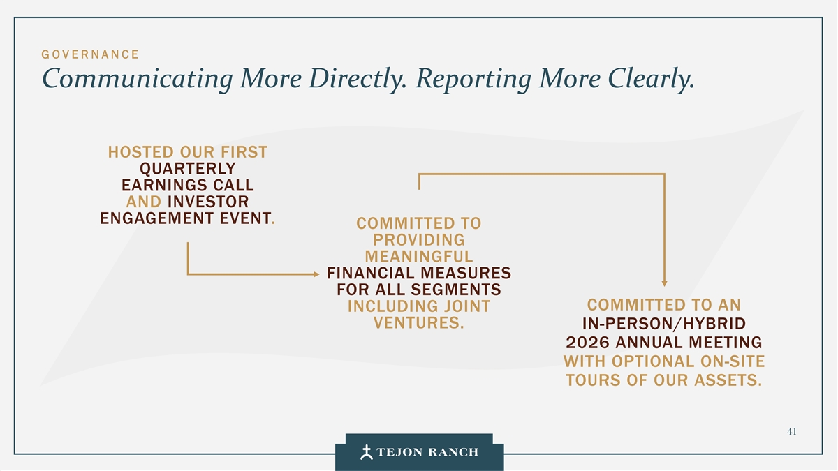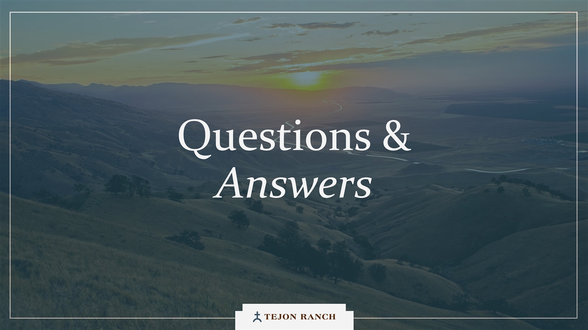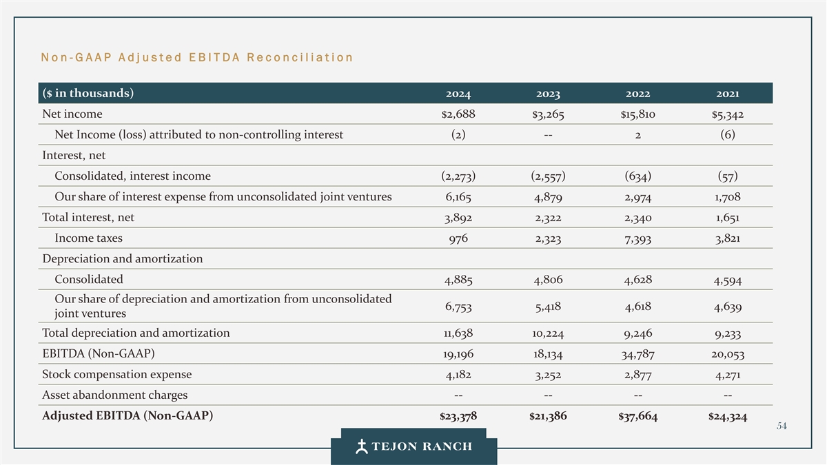 免责声明安全港声明本演示文稿包含联邦证券法含义内的前瞻性声明。一般来说,任何不以历史事实为依据的陈述都是前瞻性陈述。特别是,有关公司业务计划、战略、前景、目标、里程碑、未来经营业绩、财务状况、对资本分配的预期、成本节约、股票回购、权利和发展时间表、伙伴关系、监管改革以及其他未来事件或情况的陈述均为前瞻性陈述。这些陈述反映了公司目前对未来发展的期望和信念及其对公司的潜在影响。前瞻性陈述不是业绩的保证,仅在本函发布之日发表。“预期”、“相信”、“估计”、“预期”、“打算”、“计划”、“项目”、“目标”、“可以”、“可能”、“将”、“应该”、“将”、“可能”、“改善”、“承诺”等词语和类似表述,以及对战略、目标和意图的讨论,旨在识别前瞻性陈述。这些陈述基于当前的假设,涉及已知和未知的风险、不确定性和其他因素——其中许多因素超出了公司的控制范围——可能导致实际结果与明示或暗示的结果存在重大差异。这些因素包括但不限于市场、经济、地缘政治和天气条件;土地开发和其他活动融资的可得性和成本;竞争;商品价格和农业产量;成功获得和维持政府的权利和许可;监管或诉讼程序的时机和结果;对商业、工业、住宅和零售房地产的需求;以及房地产和农业经营固有的其他风险。无法保证实际结果不会与这些前瞻性陈述明示或暗示的结果存在重大差异。除法律要求外,公司不承担因新信息、未来事件或其他原因而更新或修改任何前瞻性陈述的义务。投资者被告诫不要过分依赖这些前瞻性陈述。有关可能导致实际结果不同的风险和不确定性的讨论,请参阅公司截至2024年12月31日的财政年度的10-K表格年度报告,以及随后向美国证券交易委员会提交的文件。非GAAP财务指标调整后EBITDA:我们使用调整后EBITDA来评估我们核心业务的业绩,用于财务和运营决策,并作为在一致基础上评估期间比较的补充或额外手段。调整后EBITDA按EBITDA(息税折旧摊销前利润)计算,不包括股票补偿费用。我们认为,调整后的EBITDA为投资者提供了相关和有用的信息,因为它允许投资者在无杠杆的基础上查看我们运营的收入,而不包括税收、折旧和摊销以及股票补偿费用的影响。通过排除利息支出和收入,EBITDA和调整后EBITDA使投资者能够独立于我们的资本结构和债务来衡量我们的业绩,因此,我们可以与其他公司的业绩进行更有意义的比较,无论是在房地产行业还是在其他行业。我们认为,排除与基于股份的薪酬相关的费用有助于比较我们在不同期间和其他公司之间的运营,而不会出现不同估值方法导致的差异、费用的波动性(这取决于我们无法控制的市场力量)以及公司可以使用的假设和奖励类型的多样性。上一张幻灯片提供了调整后EBITDA与净收入的历史衡量标准的量化对账,这是最直接可比的GAAP衡量标准。TRCC每股资产净值(NAV):用于计算NAV的输入数据来自公开披露和第三方市场数据。正如公司提交给美国证券交易委员会的文件所披露的,Tejon Ranch Co.在未合并合资企业的折旧和利息费用中所占份额用于估计归属于其50/50合资企业的净营业收入(“NOI”),不包括TA/Petro投资。适用于NOI的上限利率基于普华永道房地产投资者调查中公布的工业和零售资产的平均市场利率。土地价值假设,包括每英亩1500美元的估计,反映了历史上适用于优质牧场的遗留基准。由于在披露中对奥特莱斯和工业资产的NOI进行了汇总, 出于估值目的,对两种资产类型适用了统一的上限率。我们认为TTRCC每股NAV对股东有用,因为它说明了我们战略资产的当前价值,管理层使用这一衡量标准来评估TRCC相对于整体公司NAV的贡献。其他公司可能会以不同的方式计算NAV和与之相关的衡量标准。我们认为没有与TRCC每股NAV直接可比的GAAP衡量标准。净债务/调整后EBITDA:我们使用净债务/调整后EBITDA作为非公认会计准则财务指标来评估我们的资本结构和偿债能力。管理层认为,这一比率提供了对杠杆趋势和资本效率的有用洞察。净债务包括TRC债务和公司在未合并的合资企业持有的按比例应占债务,由合并和按比例现金抵消。调整后EBITDA被用作核心经营业绩的代表。没有与净债务直接可比的GAAP衡量标准;上面提供了对账。调整后的农业EBITDA在固定水义务之前的调节公司使用调整后的农业EBITDA在固定水义务之前评估其农业运营的业绩,这是一种非公认会计准则财务指标。管理层认为,这一衡量标准通过排除非经营性项目和固定用水义务,有意义地反映了其农业业务的基本盈利能力和现金流潜力,后者代表了无论该部门的农业活动水平如何都产生的不可控制的基础设施成本。固定用水义务反映了公司分配的与向公司财产输送和输送水相关的基础设施和融资成本的份额。这些义务主要包括为偿还加利福尼亚州发行的债券而征收的年度评估,这些债券用于为州水项目系统和当地水区水系统的建设和持续维护提供资金。持有水权的土地所有者,包括公司,有责任通过每年固定的付款来偿还这些债券。与计入耕作费用的可变用水成本不同,管理层将固定用水义务视为支持长期获得水资源的基础设施成本,而不是耕作的基本运营成本。因此,在固定水义务之前调整后的农业EBITDA允许管理层和投资者独立于与水基础设施相关的固定成本评估公司农