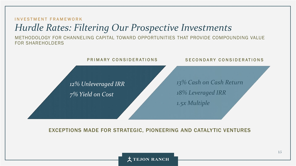 I N VESTMENT F R AMEWORK栏目率:筛选我们的前瞻性投资方法,用于将资本引导至为股东提供复合价值的机会P R I MARY C O N SIDERATI ONS E CONDARY C O NSIDERATIONS 13%现金即现金回报12%无杠杆IRR18 %杠杆IRR7 %成本收益率1.5倍为战略、先驱和催化剂企业做出的多项例外15
