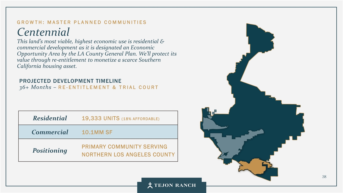 G ROW TH:M A STER P L A N NED C O MMUNITIES Centennial这片土地最可行、最高经济用途是住宅和商业开发,因为它被洛杉矶县总规划指定为经济机会区。我们将通过重新获得将一项稀缺的南加州住房资产货币化的权利来保护其价值。预计开发时间线36 +个月– RE-Entitlement & T R IAL C O URT 19,333个单位(18%负担得起)住宅10.1mm顺丰商业主要社区服务定位北洛杉矶县38