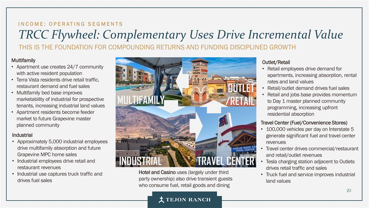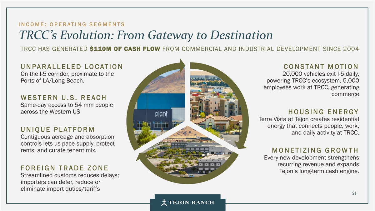 I N C OME:O P E RATI NG S E GMENTS TRCC的演变:从网关到目的地自2004年以来,TRCC已从商业和工业发展中产生了1.1亿美元的现金流,该地点位于I-5走廊上的Constant Motion无与伦比的位置,靠近每天20,000辆车的I-5出口,洛杉矶/长滩港口。为TRCC的生态系统提供动力。5000名员工在TRCC工作,产生商业Western US REACH当天可访问美国西部54毫米人群HOUSING ENERGY Terra Vista at Tejon创造住宅能源,将TRCC的人、工作、独特平台和日常活动联系起来。连片面积和吸纳量控制让我们为供应配速、保护租金、策划租户组合。货币化增长每一项新的发展都会加强经常性收入,并扩大外贸区Tejon的长期现金引擎。简化海关减少延误;进口商可推迟、降低或取消进口关税/关税21