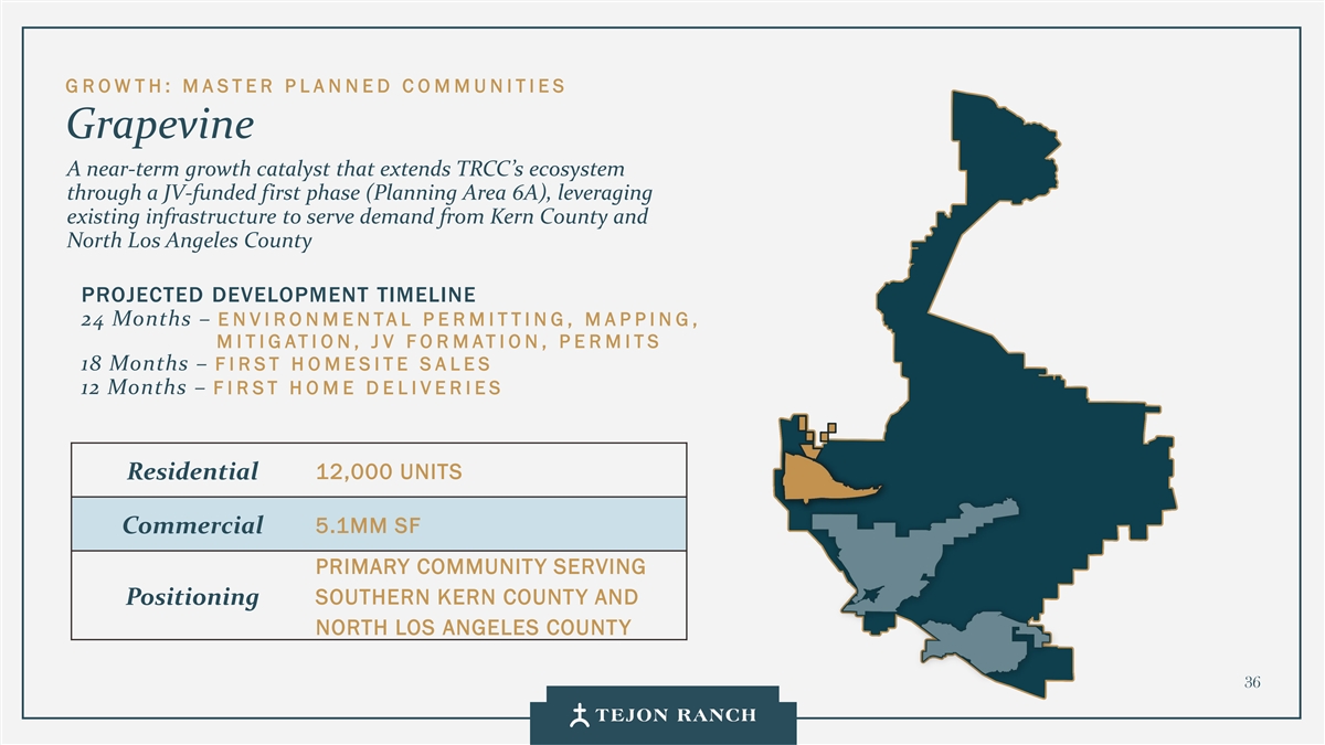 G ROW TH:M A STER P L A N NED C O MMUNITIES Grapevine一种近期增长催化剂,通过合资资助的第一阶段(规划6A区)扩展TRCC的生态系统,利用现有基础设施服务于克恩县和北洛杉矶县的需求,预计发展时间线24个月–环境许可、测绘、M I TIG ATI on、J V FO R MATION,P E R MITS 18个月– F I RST H O MESITE S A LES 12个月– F I R ST H O M E D E L IVERIES 12,000 units Residential 5.1mm SF Commercial Primary Community Serving Southern Kern County and Positioning North Los Angeles County 36