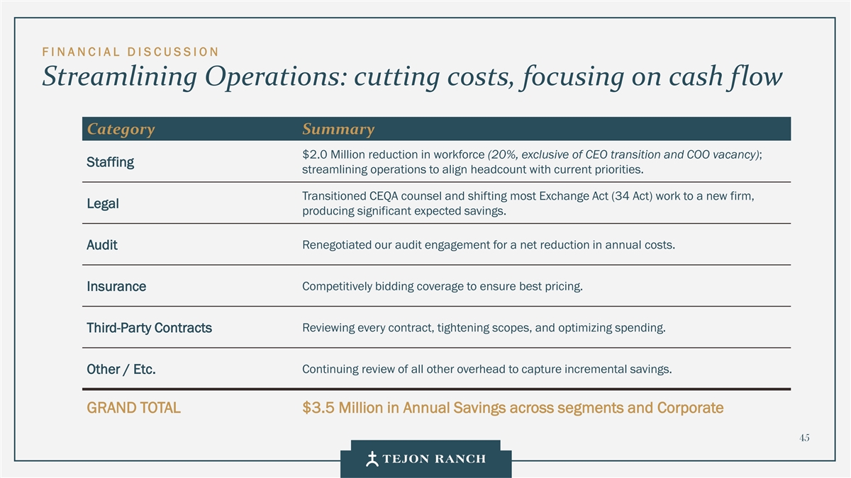 F I N ANCIAL D I S CUSSION精简运营:削减成本,专注于现金流类别摘要裁员200万美元(20%,不包括CEO过渡和COO空缺);人员配置精简运营,以使员工人数与当前优先事项保持一致。过渡CEQA法律顾问,并将大部分《交易法》(34法案)的工作转移到一家新公司,法律产生了显着的预期节省。重新谈判我们的审计业务,以净减少年度成本。审核竞争性投标覆盖范围以确保最佳定价。保险审核每一份合同,收紧范围,优化支出。第三方合同其他/等。继续审查所有其他间接费用,以获取增量节省。各部门和企业45的年度节余总计350万美元