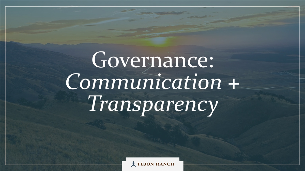 I N VESTMENT F R AMEWORK我们要去哪里,为什么?我们对未来的计划。G R OW T H Governance & Culture & I N C O M E in IT I AT IV E S C O M M U N IC A T IO N S M I N D SE T更高的收入,与荣誉土地和尊重我们的福斯特为长期股东和氛围推动现金和更低成本价值创造透明业绩E VOLVE A D T RANSFORM W I TH A LO N G-term V I SION成为加州首屈一指的以生活方式为导向的土地公司。18