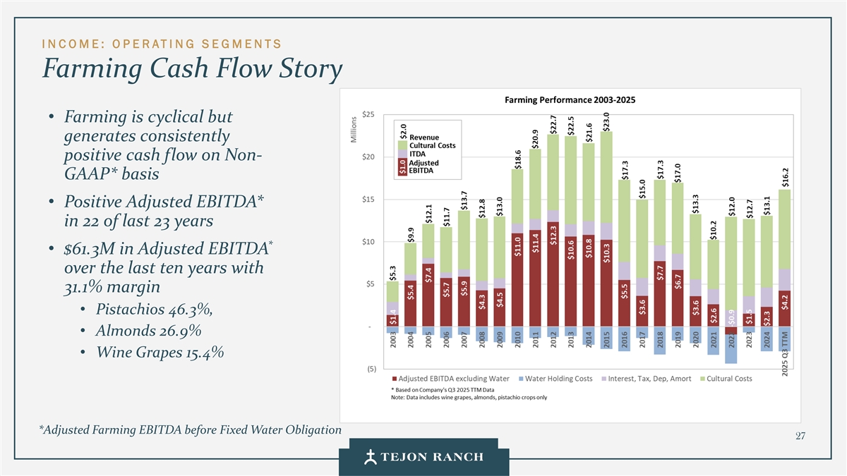 I N C OME:O P E RATI NG S E GMENTS农业现金流故事•农业是周期性的,但在Non-GAAP上持续产生正现金流*基差•调整后EBITDA为正*在过去23年中的22年*•过去十年调整后EBITDA 6130万美元,利润率31.1% •开心果46.3%,•杏仁26.9% •酿酒葡萄15.4%*固定水义务前调整后的农业EBITDA 27