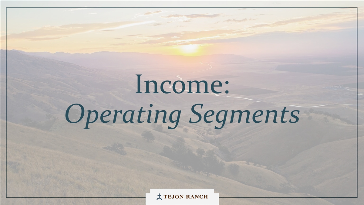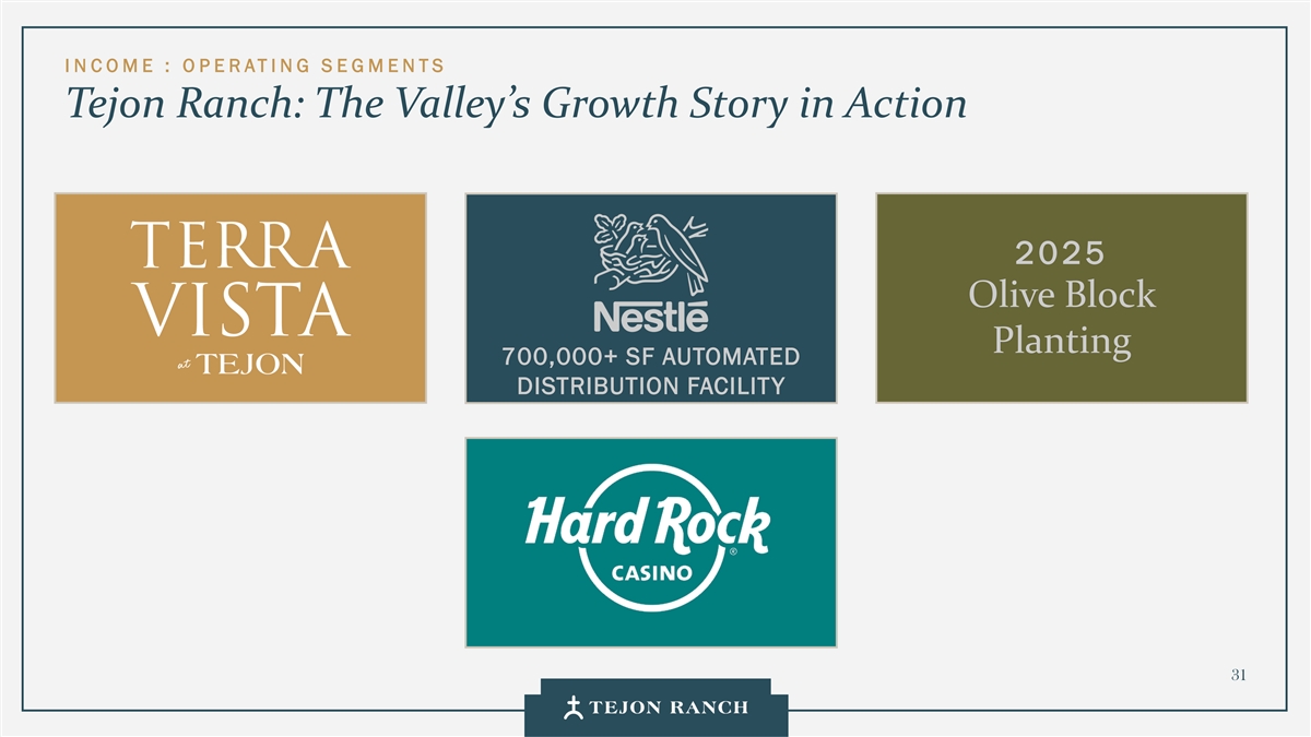 I N C OME:O P E RATI NG S E GMENTS TRCC:持续长期增长TRCC是所有投资资金的首要优先事项。我们希望在市场允许的情况下,以最快的速度建立TRCC。Tejon距离洛杉矶港2小时车程,可实现横跨美国西部的工业高效配送•主要租户:宜家、卡特彼勒、雀巢和Famous Footwear。• 700万平方英尺的工业迄今建成,100%出租•未来增长:1110万平方英尺的剩余权利捕捉来自西海岸最繁忙的旅行零售/走廊的需求,每天为20,000个车辆出口提供服务。OUTLETS主要租户:Nike、Polo Ralph Lauren、Tommy Hilfiger、ULTA •已建成67.4万平方英尺的零售面积••未来增长:28.2万平方英尺,满足TRCC员工队伍的住房需求和Southern Residential Kern不断扩大的经济。Tejon的Terra Vista是该公司首个住宅•开发项目228个单元于2025年交付••未来增长:剩余267个有权Terra Vista单元22个有权获得额外1.1mm sF工业空间的土地已出售给第三方