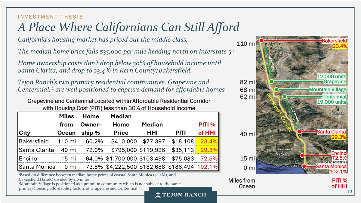 I N VESTMENT T H ESIS一个加州人仍然可以负担得起加州住房市场的地方,已经让中产阶级的价格超出了预期。Bakersfield 110 mi 23.4% 1在5号州际公路向北行驶,房价中值每英里下跌3.5万美元。房屋所有权成本在圣克拉丽塔之前不会低于家庭收入的30%,在克恩县/贝克斯菲尔德降至23.4%。1.2万套Grapevine Tejon牧业的两个主要居住社区Grapevine和82 mi 2 Mountain Village Centennial,有能力抓住经济适用房的需求68 mi62 miCentennial Grapevine和Centennial Located within Affordable Residential Corridor 19,000 units with Housing Cost(PITI)less than 30% of Household Income Miles Home Median from Owner-Home Median PITI % Santa Clarita City Ocean Ship % Price HHI PITI of HHI 40 mi 29.3% Bakersfield 110 mi 60.2% $ 410,000 $ 77,397 $ 18,10823.4% Santa Clarita 40 mi 72.0% $ 795,000 $ 119,926 $ 35,11329.3% Encino 72.5% Encino 15 mi 64.0% $ 1,700,000 $ 103,498 $ 75,08372.5% 15 mi Santa Monica Santa Monica 0 mi 73.8% $ 4,222,500 $ 182,688 $ 186和Bakersfield($ 410K)隔110英里距离PITI % 1 Mountain Village被定位为高级社区,不受制于与Grapevine和Centennial 13相同的HHI初级住房可负担性因素的海洋