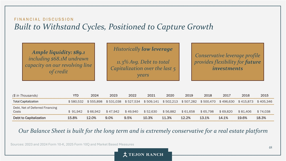 F I N ANCIAL D I S CUSION旨在抵御周期,定位于捕捉增长历史上的低杠杆充足的流动性:89.1美元的保守杠杆状况,包括6810万美元未提取的11.3%平均。债务总额为我们循环额度的未来产能提供了灵活性过去5个信用年度的资本化(以千美元计)年初至今20242023202220212020202020192018201720162015总资本化580,532美元555,898美元531,038美元527,534美元509,141美元502,213美元507,282美元500,470美元496,630美元415,873美元405,346美元债务,扣除递延融资成本91,942美元66,942美元47,942美元49,940美元52,630美元56,882美元61,658美元65,798美元69,820美元81,406美元74,038美元债务资本化15.8% 12.0% 9.0% 9.5% 10.3% 11.3% 12.2% 13.1% 14.1% 19.6% 18.3%我们的资产负债表是为长期建立的,对于房地产平台而言极为保守来源:2023和2024表格10-K、2025表格10Q和基于市场的措施48