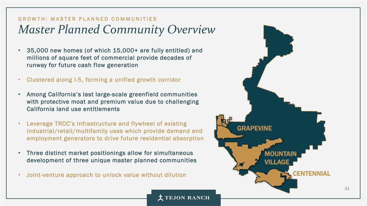 G ROW TH:M A STER P L A N NED C O MMUNITIES The Case for the MPC Company Responses Investor Concerens Entremities have created significant value to date with significant capital spent to date without protective moat of value given long California process and any construction uncertain timing perception权利一直是批准时间框架在合理参数范围内不成功且没有价值公司灵活且始终考虑战略对未来时间安排的替代方案缺乏明确性项目可能会稀释通过合资企业寻求MPC资本化以避免稀释股东的投资考虑需要定制的方法来感知MPC的资金是以牺牲每个社区为代价的,而不是一揽子战略或一刀切更值得TRCC投资的经济性。交付一个高十几岁或认为往前走经济学不是更好的合资企业回报超过10到20年是非常有吸引力的。令人信服的认为公司应该出售Mountain Village公司必须做得更好,以提供更清晰和百年土地并分配股息,关于成本和时间回购股票和/或投资TRCC 34
