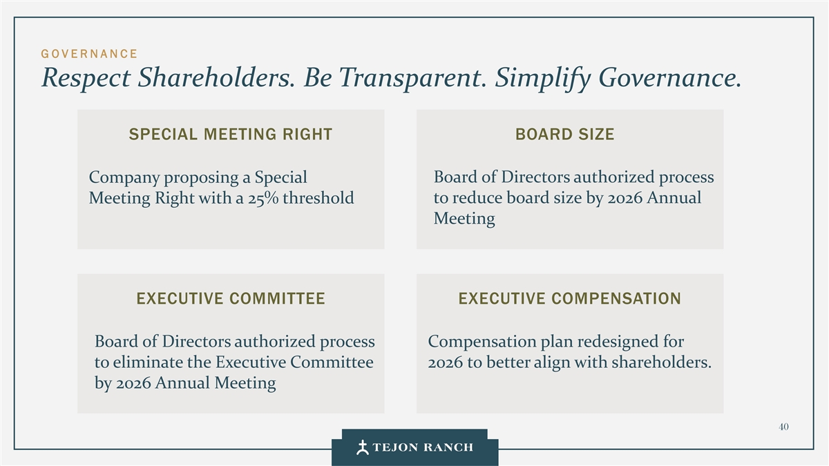 G O VE R NA NC E尊重股东。要透明。简化治理。特别会议权利董事会规模公司提议特别董事会授权流程会议权利,门槛为25%,以在2026年年会前减少董事会规模执行委员会执行薪酬董事会授权流程薪酬计划重新设计,以取消执行委员会2026年,以更好地与股东保持一致。到2026年年会40