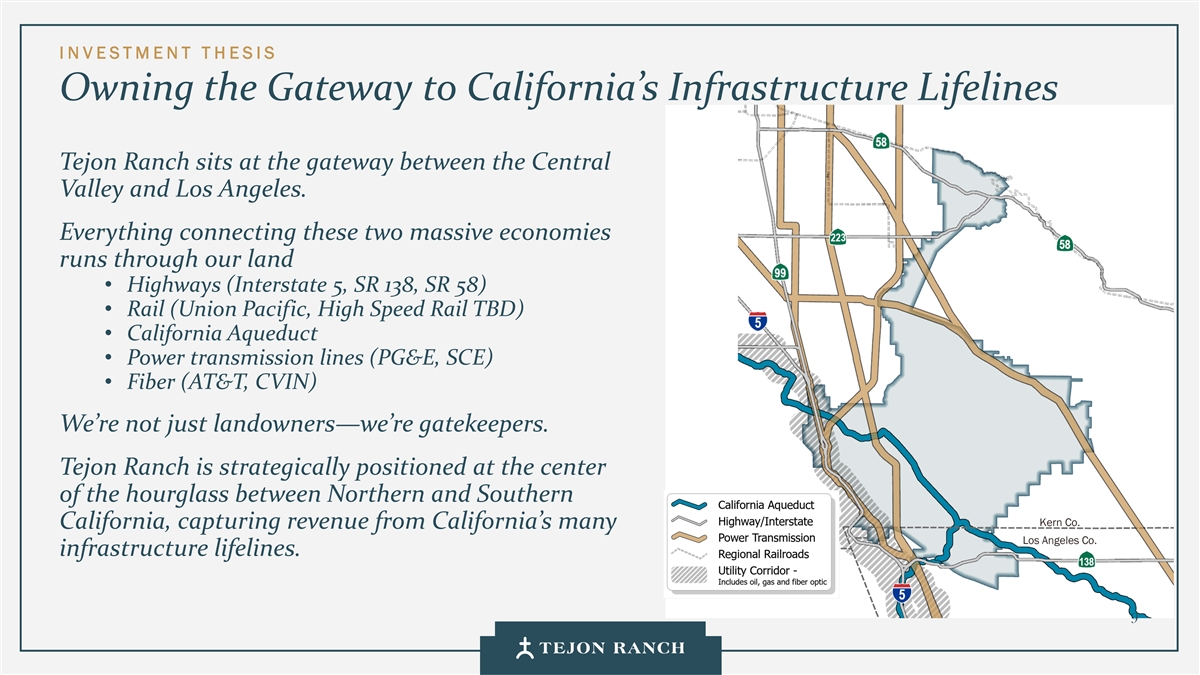拥有通往加州基础设施生命线门户的I N VESTMENT T H ESIS Tejon牧业坐落在中央山谷和洛杉矶之间的门户。连接这两个庞大经济体的一切都贯穿我们的国土•高速公路(5号州际公路,SR138,SR58)•铁路(联合太平洋,高铁待定)•加州渡槽•电力传输线路(太平洋煤气和电力,SCE)•光纤(美国电话电报,CVIN)我们不仅仅是土地所有者——我们还是守门人。Tejon牧业战略性地定位于加利福尼亚州北部和南部Kern Co. California之间沙漏的中心,从加利福尼亚州洛杉矶公司的许多基础设施生命线中获取收入。9