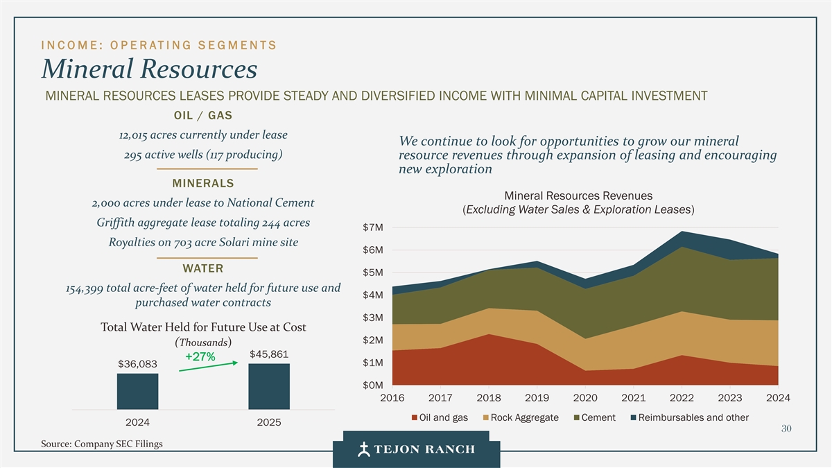 I N C OME:O P E RATI NG S E GMENTS矿产资源矿产资源租赁以最低资本投资石油/天然气提供稳定和多样化的收入12,015英亩目前处于租赁状态我们继续寻找机会,通过扩大租赁来增加我们的矿产295口活跃井(117口生产)资源收入并鼓励新的勘探矿产资源租赁给国家水泥公司的2,000英亩矿产资源收入(不包括水销售和勘探租赁)Griffith骨料租赁总计244英亩703英亩Solari矿址的700万美元特许权使用费600万美元水500万美元154,399英亩-英尺的总持水量以供未来使用,以及400万美元的已购水合同3M未来使用的总持水量成本200万美元(千美元)45,861美元+ 27% 100万美元36,083美元201620172018201920202021202220232024石油和天然气岩石骨料水泥报销和其他2024202530资料来源:公司SEC文件