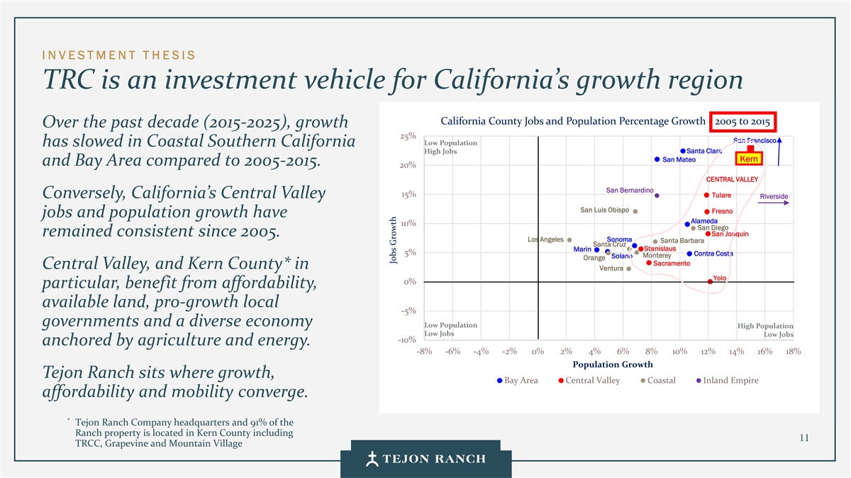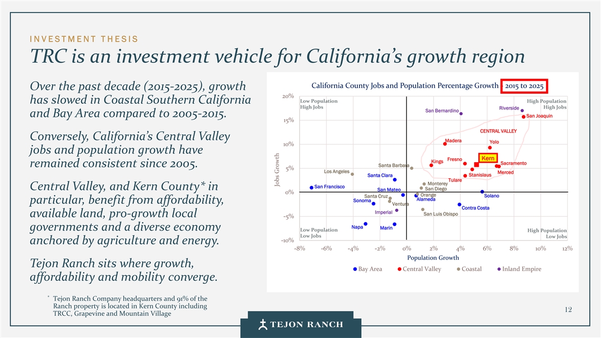 I N VESTMENT T H ESIS TRC是加利福尼亚州增长地区的投资工具,加利福尼亚县就业和人口百分比增长-2015年至2025年在过去十年(2015-2025年)中,增长20%低人口高人口与2005-2015年相比,南加州沿海地区的沿海地区高就业高就业河滨圣贝纳迪诺和湾区。San Joaquin 15% Central Valley反过来,加州的Central Valley Madera Yolo 10%的就业机会和人口增长让K Kee rn rn Fresno Kings Sacramento自2005年以来一直保持稳定。Santa Barbara 5% Los Angeles Merced Stanislaus Santa Clara Tulare Monterey San Francisco Central Valley,and Kern County*在圣地亚哥圣马特奥0%橙色Santa Cruz Solano Alameda Sonoma特别,受益于负担能力,Ventura Contra Costa Imperial San Luis Obispo可用土地,促进增长的地方-5 %纳帕马林政府和多元化的经济低人口高人口低就业低就业-10%以农业和能源为基础。-8 %-6 %-4 %-2 %0% 2% 4% 6% 8% 10% 12%人口增长Tejon牧业坐落于增长、湾区中央谷地沿海内陆帝国的可负担性和流动性交汇的地方。*Tejon牧业公司总部及牧场91%的物业位于克恩县包括12 TRCC、Grapevine和Mountain Village Jobs Growth