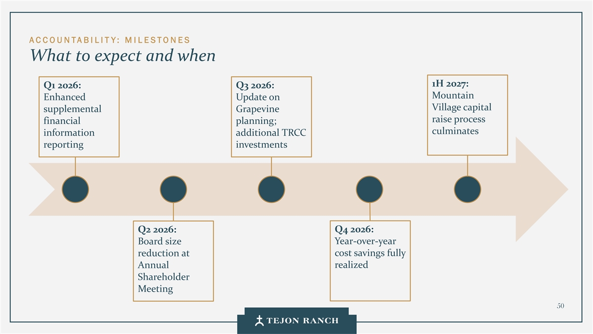 AC COUNTABI LIT Y:M I L ESTONES预期和时间1H 2027:Q1 2026:Q3 2026:Mountain Enhanced Update on Village Capital Supplement Grapevine Raise Process Financial Planning;cumulates Information额外TRCC报告投资Q2 2026:Q4 2026:Board size year-on-year reduction at cost savings fully realized annual shareholder meeting 50