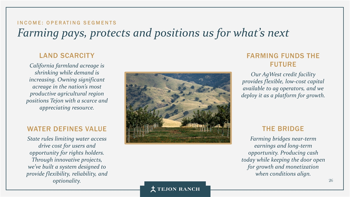 I N C OME:O P E RATI NG S E GMENTS农业支付、保护和定位我们为下一个土地稀缺提供资金未来加州农田面积正在萎缩,而需求是我们的AgWest信贷额度在增加。Owning significant在农业运营商最容易获得的全国范围内提供了灵活、低成本的资本面积,we productive agricultural region将其部署为增长平台。将Tejon定位为稀缺且升值的资源。桥水定义了价值州的规则,限制了供水农耕桥的用户和收益的近期驱动成本以及权利持有者的长期机会。机会。通过创新项目产生现金,今天,在保持大门敞开的同时,我们建立了一个系统,旨在为增长和货币化提供灵活性、可靠性,并在条件一致时提供。26个可选性。