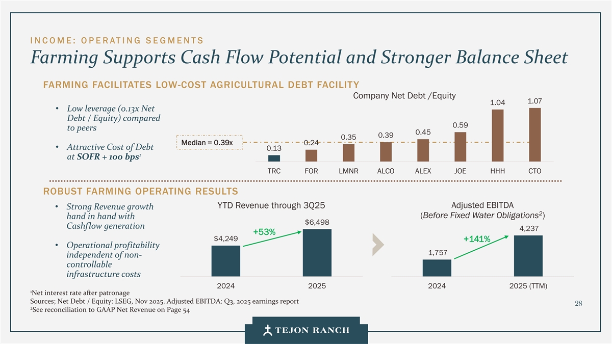 i N C OME:O P E RATI NG S E GMENTS农业支持现金流潜力更强的资产负债表Farming促进低成本农业债务融资公司净债务/权益1.07 1.04 •低杠杆(0.13倍净债务/权益)与同行相比为0.59 0.45 0.39 0.35中值= 0.39x 0.24 •具有吸引力的债务成本0.13 1,SOFR + 100个基点的TRC对于丨LMNR 丨LMNRALCO丨Alex JOE丨HHH HHH丨CTOTERM4稳健的农业经营使年初至今的收入通过3Q25调整后EBITDA •强劲的收入增长2(在固定水义务之前)携手6,498美元现金流产生4,237 + 53% $ 4,249 + 141% •运营盈利能力1,757(TTM)1扣除赞助来源的净利率;净债务/权益:伦敦证券交易所集团,2025年11月。调整后EBITDA:2025年第三季度收益报告282见第54页与GAAP净收入的对账