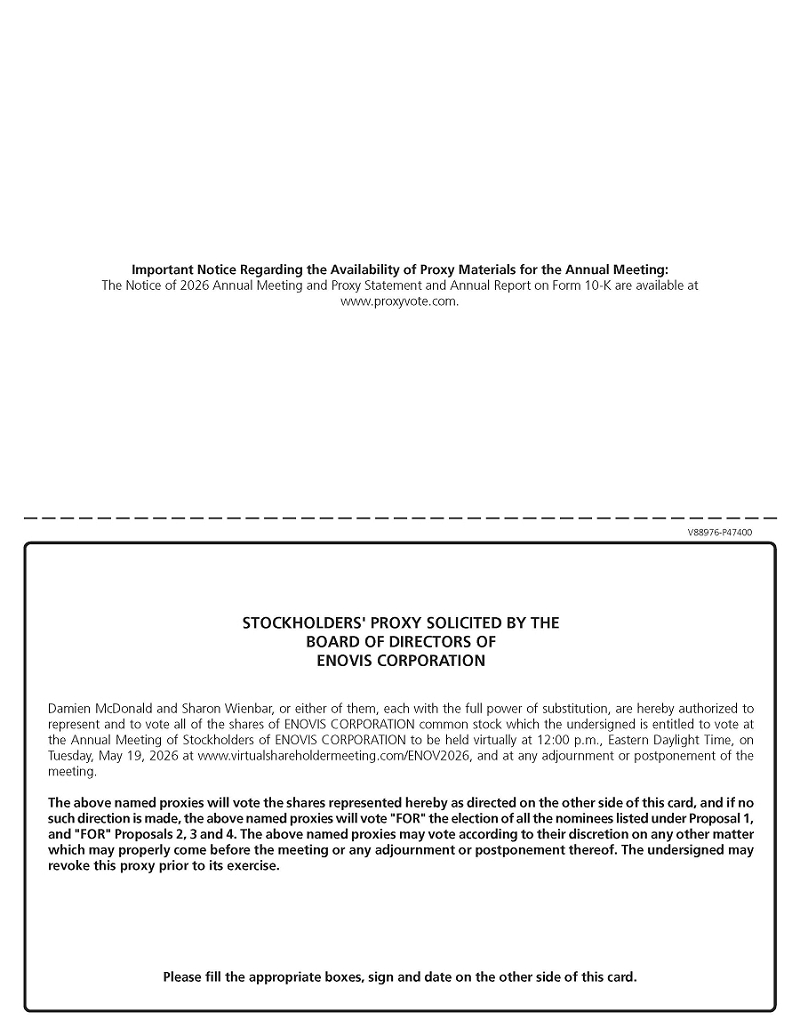 特此通知,Enovis Corporation(“Enovis”)2026年年度股东大会(“年度会议”)将于美国东部时间2026年5月19日(星期二)下午12:00通过www.virtualshareholdermeeting.com/ENOV2026通过网络直播方式召开,会议用途如下: