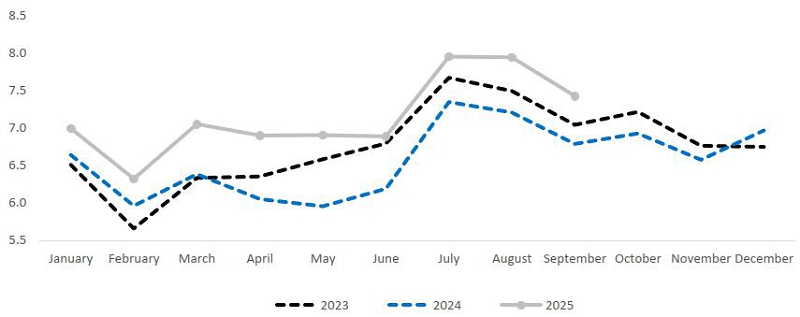 与2024年同月相比,9月份的总客运量增长了9.4%。国内客运量同比增长10.9%,主要受阿根廷带动,同时巴西表现强劲。与此同时,国际运输量增长8.0%,所有运营国家均同比贡献正增长——乌拉圭和厄瓜多尔除外——尤其是阿根廷和意大利表现强劲。值得注意的是,阿根廷占9月总交通同比增长的79%以上。