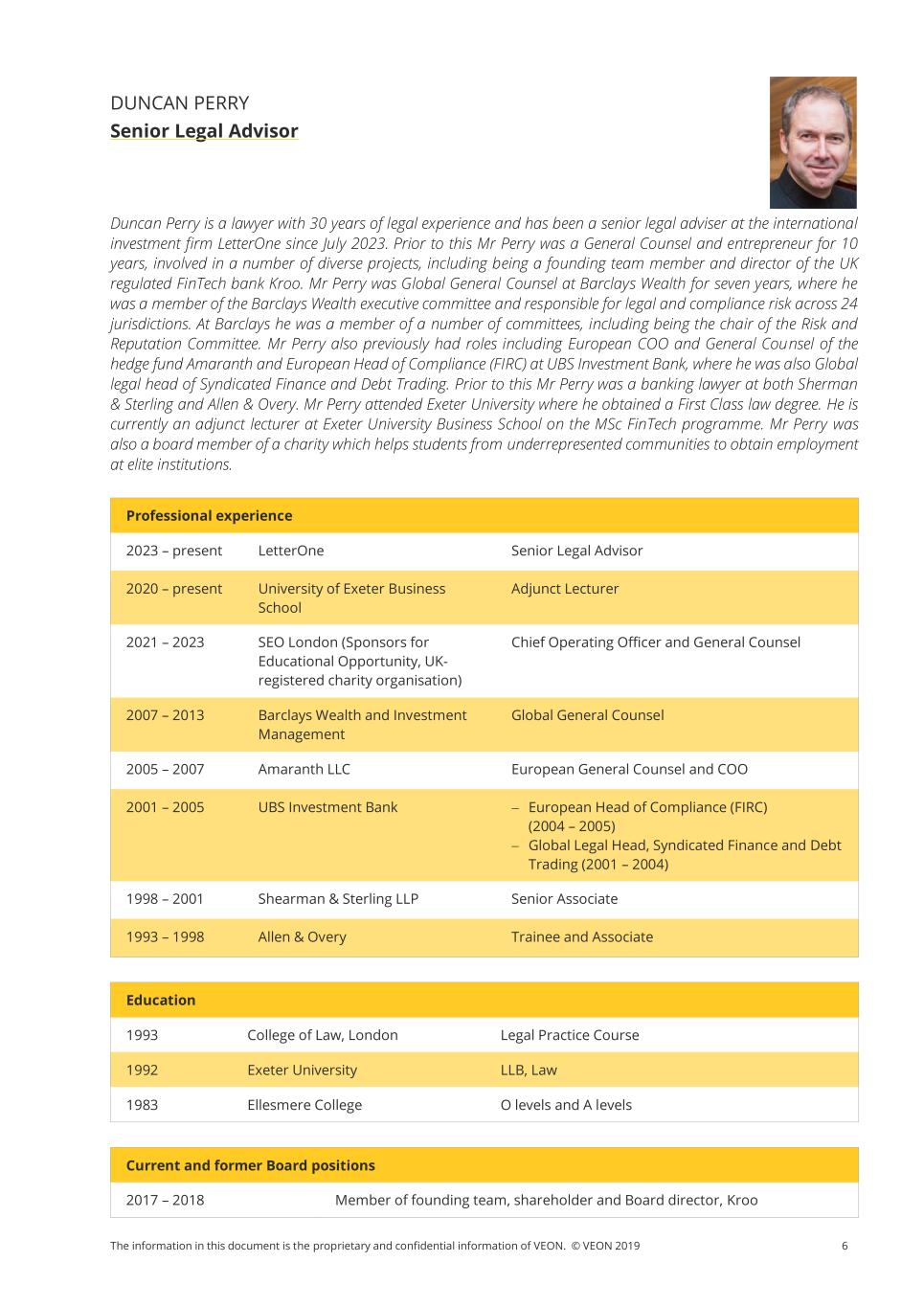 本文档中的信息是VEON的专有和机密信息。© VEON 20196DUNCAN PERY高级法律顾问Duncan Perry是一名律师,拥有30年的法律经验,自2023年7月起担任国际投资公司LetterOne的高级法律顾问。在此之前,佩里先生担任了10年的总法律顾问和企业家,参与了多个不同的项目,包括英国受监管的金融科技银行KROO的创始团队成员和董事。佩里先生曾在巴克莱银行 Wealth担任了七年的全球总法律顾问,曾担任巴克莱银行 Wealth执行委员会成员,负责24个司法管辖区的法律和合规风险。在巴克莱银行,他是多个委员会的成员,包括风险和声誉委员会的主席。佩里此前还担任过职务,包括对冲基金Amaranth的欧洲首席运营官和总法律顾问,以及瑞银投资银行的欧洲合规主管(FIRC),他还曾担任银团金融和债务交易的全球法律主管。在此之前,佩里先生是Sherman & Sterling和Allen & Overy的银行业律师。佩里先生就读于埃克塞特大学,在那里他获得了一级法学学位。他目前是埃克塞特大学商学院关于MSC金融科技项目的兼职讲师。佩里先生还是一家慈善机构的董事会成员,该机构帮助来自代表性不足社区的学生在精英机构就业。专业经验2023 –现在LetterOne高级法律顾问2020 –现在埃克塞特大学商学院兼职讲师2021 – 2023 SEO London(Educational Opportunity Sponsors,英国注册慈善组织)首席运营官和总法律顾问2007 – 2013 巴克莱银行财富与投资管理全球总法律顾问2005 – 2007 Amaranth LLC欧洲总法律顾问和首席运营官2001– 2005 UBS Investment Bank −欧洲合规主管(FIRC)(2004 – 2005)−全球法律主管,银团融资和债务交易(2001 – 2004)1998 – 2001 Shearman & Sterling LLP高级助理1993 – 1998 Allen & Overy实习生和助理教育1993伦敦法律实践课程法学院1992 Exeter University LLB,Law 1983 Ellesmere College O levels and A levels现任和前任董事会职位2017 – 2018创始团队成员、股东和董事会董事,KROO