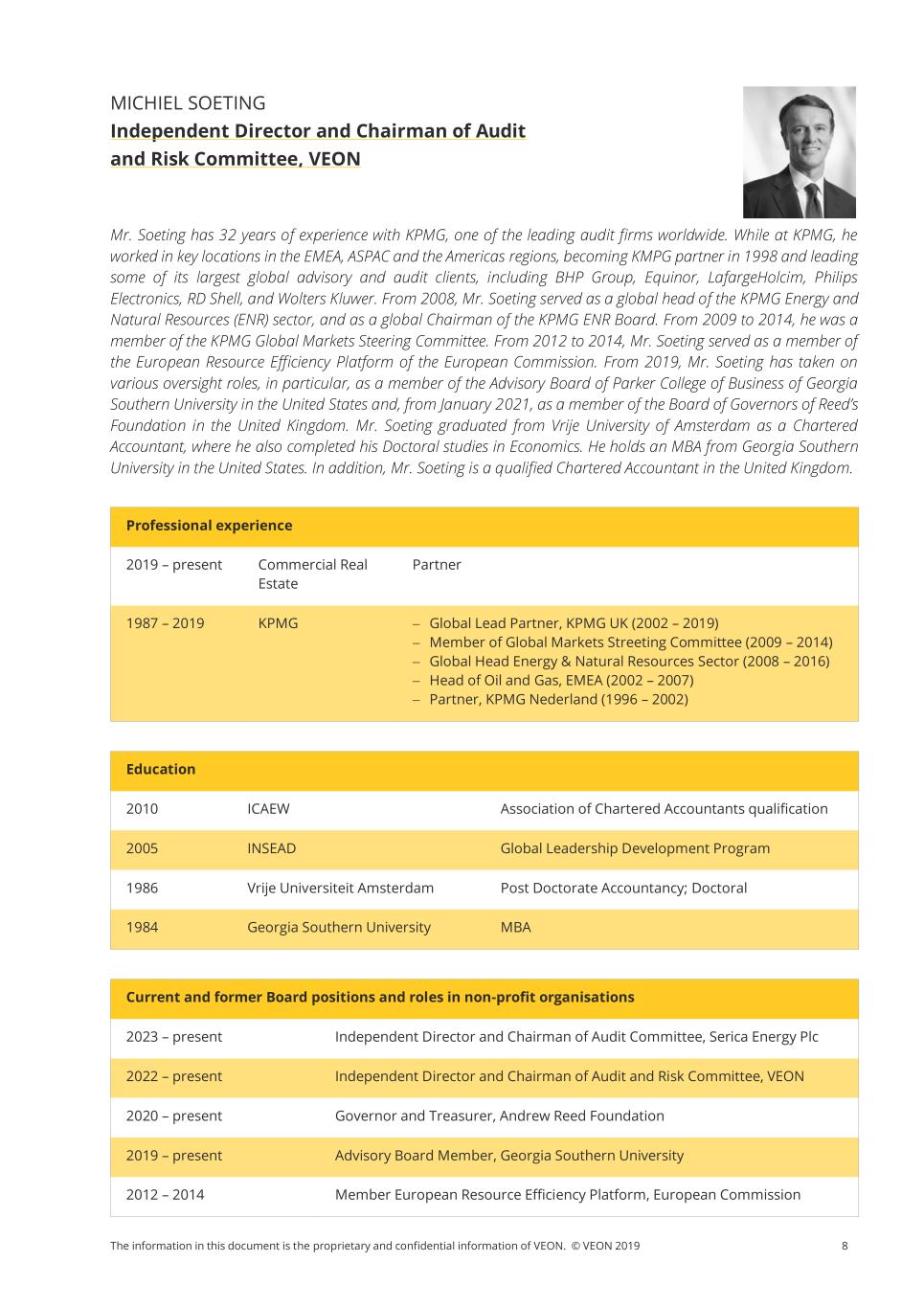 本文档中的信息是VEON的专有和机密信息。© VEON 20198MICHIEL SOETING独立董事、审计与风险委员会主席,VEON Soeting先生在毕马威会计师事务所(全球领先的审计公司之一)拥有32年的工作经验。在毕马威任职期间,他曾在欧洲、中东和非洲、ASPAC和美洲地区的关键地点工作,于1998年成为毕马威合伙人,并领导其一些最大的全球咨询和审计客户,包括必和必拓集团、Equinor、拉法基豪瑞、飞利浦电子、RD Shell和威科集团。从2008年起,Soeting先生担任毕马威能源和自然资源(ENR)部门的全球主管,以及毕马威ENR董事会的全球主席。2009年至2014年,他是毕马威全球市场指导委员会的成员。2012年至2014年,Soeting先生担任欧盟委员会欧洲资源效率平台成员。从2019年起,Soeting先生开始担任各种监督职务,特别是担任美国乔治亚南方大学帕克商学院顾问委员会成员,并从2021年1月起担任英国里德基金会理事会成员。Soeting先生以特许会计师的身份毕业于阿姆斯特丹自由大学,并在那里完成了经济学博士学位的学习。他拥有美国乔治亚南方大学MBA学位。此外,Soeting先生是英国的一名合格特许会计师。专业经验2019 –至今商业地产合伙人1987 – 2019毕马威−全球首席合伙人,毕马威英国(2002 – 2019)−全球市场街道委员会成员(2009 – 2014)−全球主管能源和自然资源部门(2008 – 2016)−欧洲、中东和非洲地区石油和天然气主管(2002 – 2007)−合伙人,KPMG Nederland(1996 – 2002)Education 2010 ICAEW Association of Chartered Accountants Qualification 2005 INSEAD Global Leadership Development Program 1986 Vrije Universiteit Amsterdam Post博士会计学;Doctoral 1984 Georgia Southern University MBA现任和前任董事会职位以及在非营利组织中的角色2023 –现任Serica Energy Plc独立董事兼审计委员会主席2022 –现任独立董事兼审计和风险委员会主席,VEON 2020 –现任Andrew Reed Foundation州长兼财务主管2019 –现任顾问委员会成员,Georgia Southern University 2012 – 2014 Member European Resource Efficiency Platform,European Commission