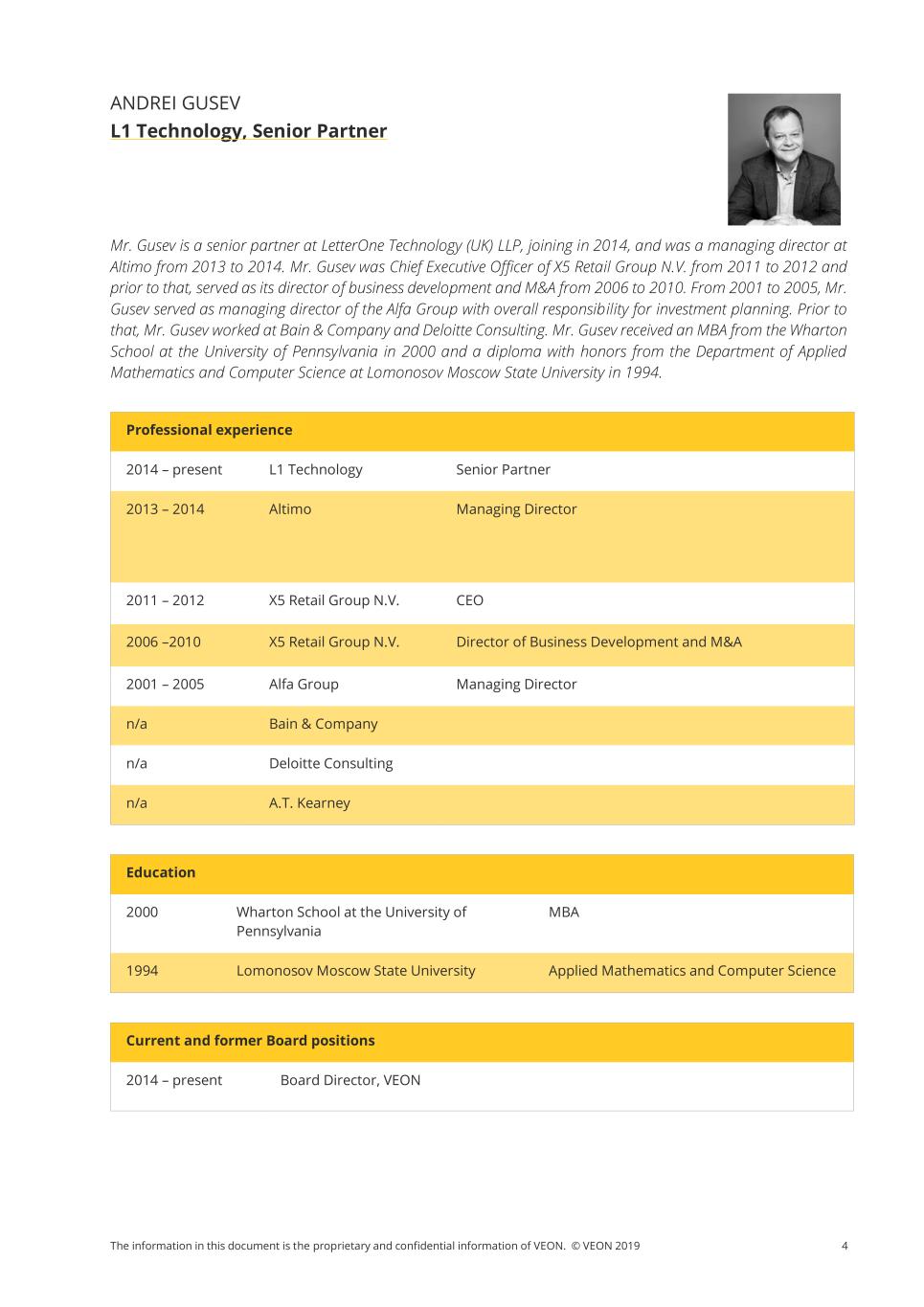 本文档中的信息是VEON的专有和机密信息。© VEON 20194 ANDREI GUSEV L1 Technology,高级合伙人Gusev先生是LetterOne Technology(UK)LLP的高级合伙人,2014年加入,2013年至2014年担任Altimo的董事总经理。Gusev先生于2011年至2012年担任X5 Retail Group N.V.的首席执行官,在此之前,于2006年至2010年担任该公司的业务发展和并购总监。2001年至2005年,Gusev先生担任阿尔法集团董事总经理,全面负责投资规划。在此之前,Gusev先生曾任职于贝恩公司和德勤咨询公司。Gusev先生于2000年获得宾夕法尼亚大学沃顿商学院的MBA学位,并于1994年获得罗蒙诺索夫莫斯科国立大学应用数学和计算机科学系的荣誉文凭。专业经验2014 –至今L1技术高级合伙人2013 – 2014 Altimo董事总经理2011 – 2012 X5 Retail Group N.V.首席执行官2006 – 2010 X5 Retail Group N.V.业务发展和并购总监2001 – 2005 Alfa Group董事总经理n/a Bain & Company n/a Deloitte Consulting n/a A.T. Kearney Education 2000 Wharton School at the University of Pennsylvania MBA 1994Lomonosov Moscow State University Applied Mathematics and Computer Science现任和前任董事会职务2014 –现任董事会董事,VEON