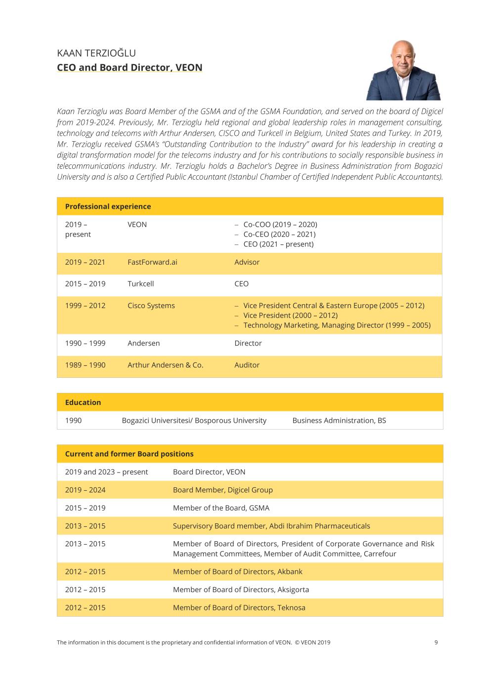 本文档中的信息是VEON的专有和机密信息。© VEON 2019年第9届KAAN TERZIO LU首席执行官兼董事会董事,VEON丨Kaan Terzioglu是GSMA和GSMA基金会的董事会成员,并于2019年-2024年期间在Digicel董事会任职。此前,Terzioglu先生曾在比利时、美国和土耳其的Arthur Andersen、CISCO和Turkcell担任管理咨询、技术和电信方面的区域和全球领导职务。2019年,Terzioglu先生因在为电信行业创造数字化转型模式方面发挥的领导作用以及在电信行业对社会负责的业务方面所做的贡献而获得GSMA“对行业的杰出贡献”奖。Terzioglu先生拥有Bogazici大学工商管理学士学位,同时也是一名注册会计师(伊斯坦布尔注册独立会计师协会)。专业经验2019 –至今VEON −联席首席运营官(2019 – 2020)−联席首席执行官(2020 – 2021)−首席执行官(2021 –至今)2019 – 2021 FastForward.ai Advisor 2015 – 2019 Turkcell首席执行官1999 – 2012丨思科丨−中欧和东欧副总裁(2005 – 2012)−副总裁(2000 – 2012)−技术营销、董事总经理(1999 – 2005)1990 – 1999 Andersen董事1989 – 1990 Arthur Andersen & Co. Auditor Education 1990 Bogazici Universitesi/Bosporous University Business Administration,BS现任和前任董事会职务2019和2023年–现任董事会董事,VEON 2019 – 2024年董事会成员,Digicel Group 2015 – 2019年董事会成员,GSMA 2013 – 2015年监事会成员,Abdi Ibrahim Pharmaceuticals 2013 – 2015年董事会成员,公司治理和风险管理委员会主席,审计委员会成员,家乐福2012 – 2015年董事会成员,Akbank 2012 – 2015年董事会成员,Aksigorta 2012 – 2015年董事会成员,Teknosa董事会成员